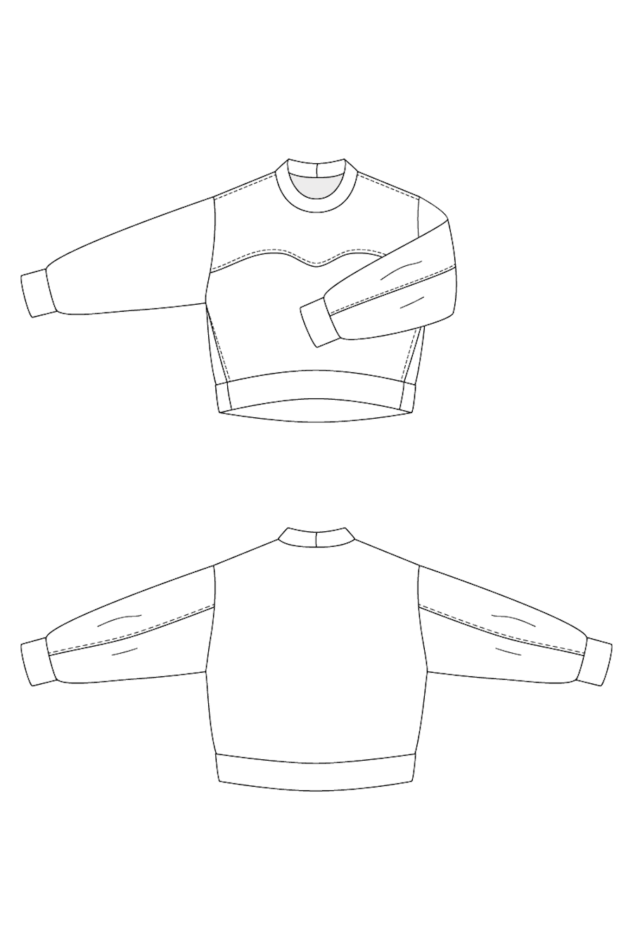 The Aalto Sweatshirt is a casual everyday sweatshirt sewing pattern designed with a distinctive and stylish wavy front seam. It features a relaxed, slightly oversized fit, gently forward-curving side seams, a curved raglan seam at the back sleeves, and a softly curved hem. The sculptural seamlines can optionally be highlighted with decorative topstitching.