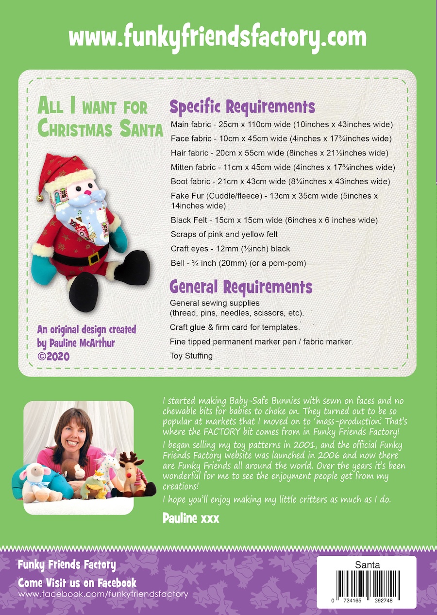Everyone loves Santa Claus, especially when he brings you ALL you want for Christmas! Father Christmas looks great in all sorts of Christmas fabrics, not just red and green, although he was told he HAS to have green mittens! This big, huggable Santa buddy would be happy under the tree or on a shelf next to your favourite elf!