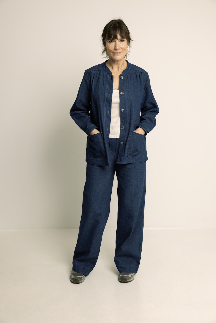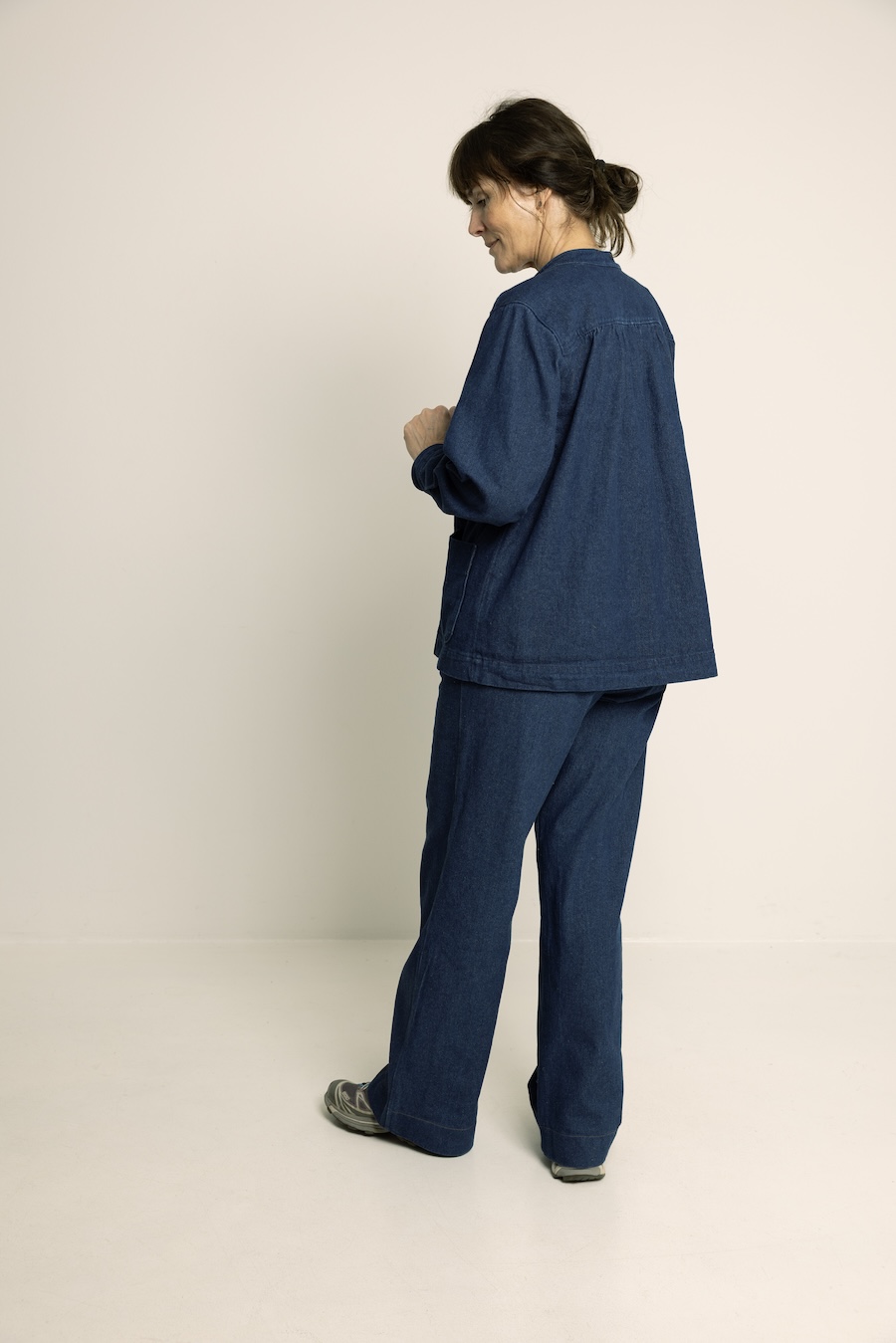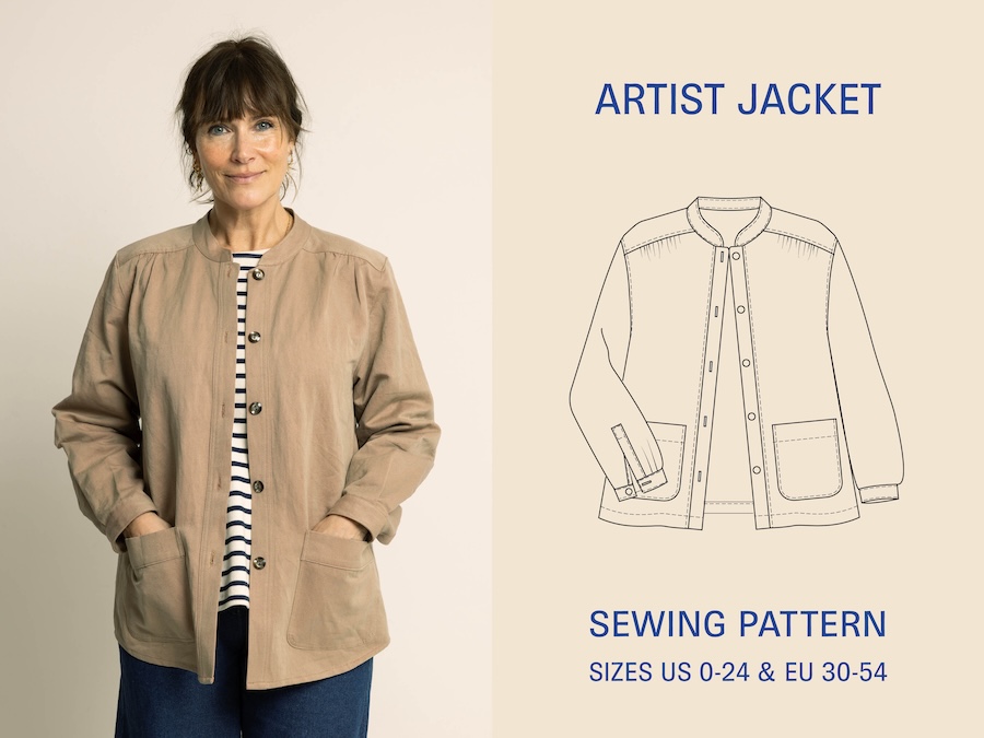 The Artist Jacket Sewing Pattern is a relaxed, functional workwear-inspired piece with dropped shoulders, a front button placket, large patch pockets, and a minimalistic banded collar.