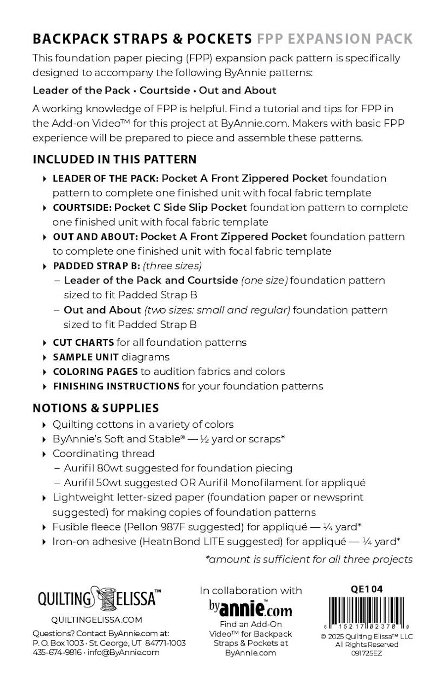 Looking to add a little more color piecing quilting or creativity in your life Quilting Elissa created this FPP (foundation paper piecing) Expansion Pack specifically to customize Backpack Straps and Pockets on three ByAnnie patterns (Leader of the Pack Courtside and Out and About).