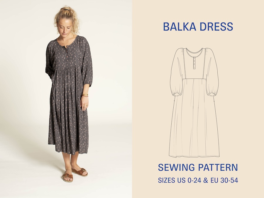 Designed with versatility in mind, Balka offers endless possibilities. The dress's skirt boasts numerous gathers at the waist, adding volume and movement to your ensemble. Complete with side seam pockets for practicality and convenience; this pattern seamlessly combines style and functionality.