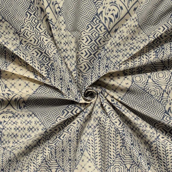 Blue On Beige Abstract Indian Block Print In Cotton By Modelo Fabrics