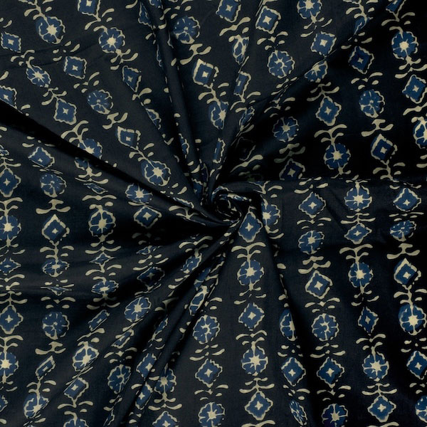 Cream On Indigo Floral Indian Block Print In Cotton By Modelo Fabrics