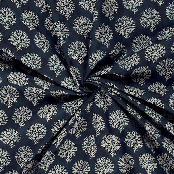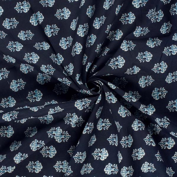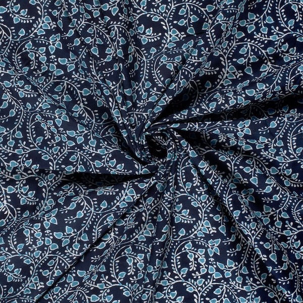 Blues On Indigo Leaves Indian Block Print In Cotton By Modelo Fabrics
