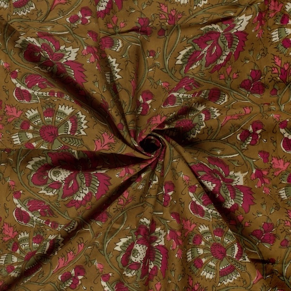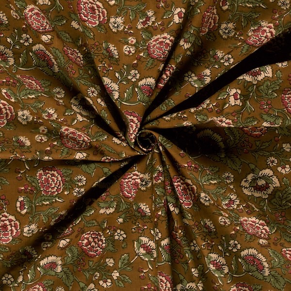 Green And Red On Ochre Floral Indian Block Print In Cotton By Modelo Fabrics