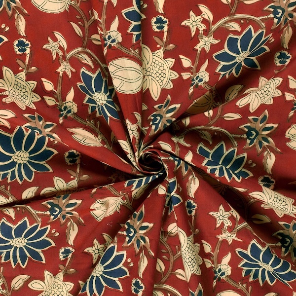 Blue And Cream On Red Floral Indian Block Print In Cotton By Modelo Fabrics