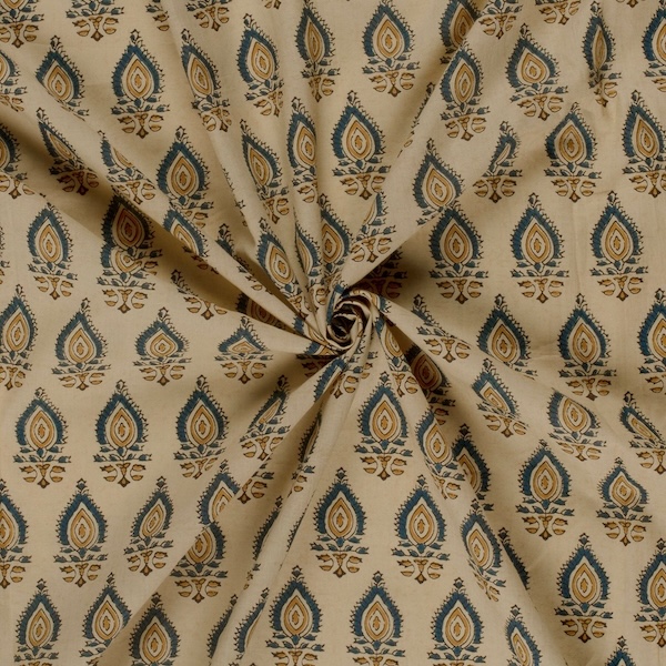 Beige And Blue On Copper Leaves Indian Block Print In Cotton By Modelo Fabrics