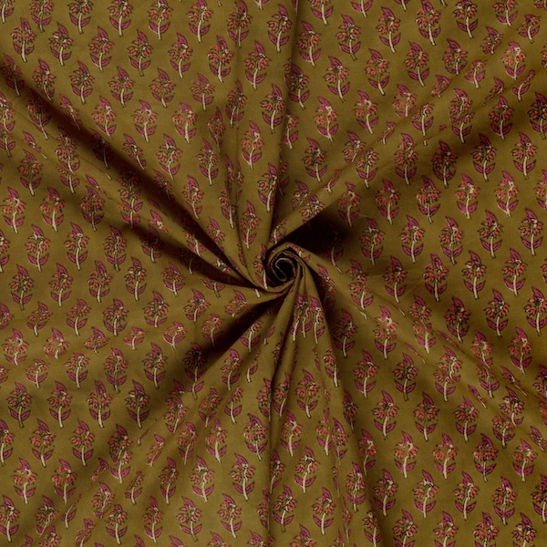 Wine On Olive Floral Indian Block Print In Cotton By Modelo Fabrics
