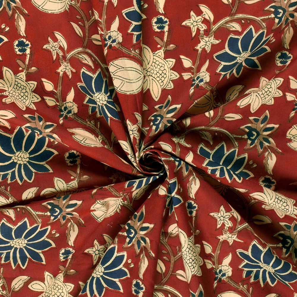 Blue And Cream On Red Floral Indian Block Print In Cotton By Modelo Fabrics