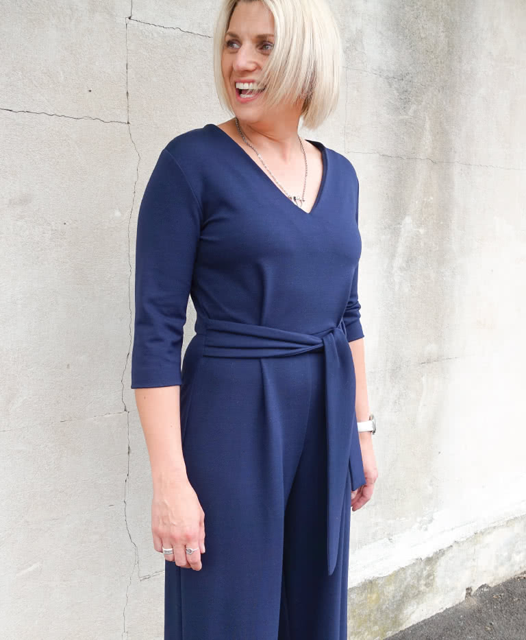 This understated style has a "V" neck, tie belt and it is fitted to a comfortable and flattering silhouette. The "of the moment" wide leg sits on the ankle. The skirt is a pencil shape and sits just below the knee. Make it with 3/4 sleeves or for warmer days it works well sleeveless.