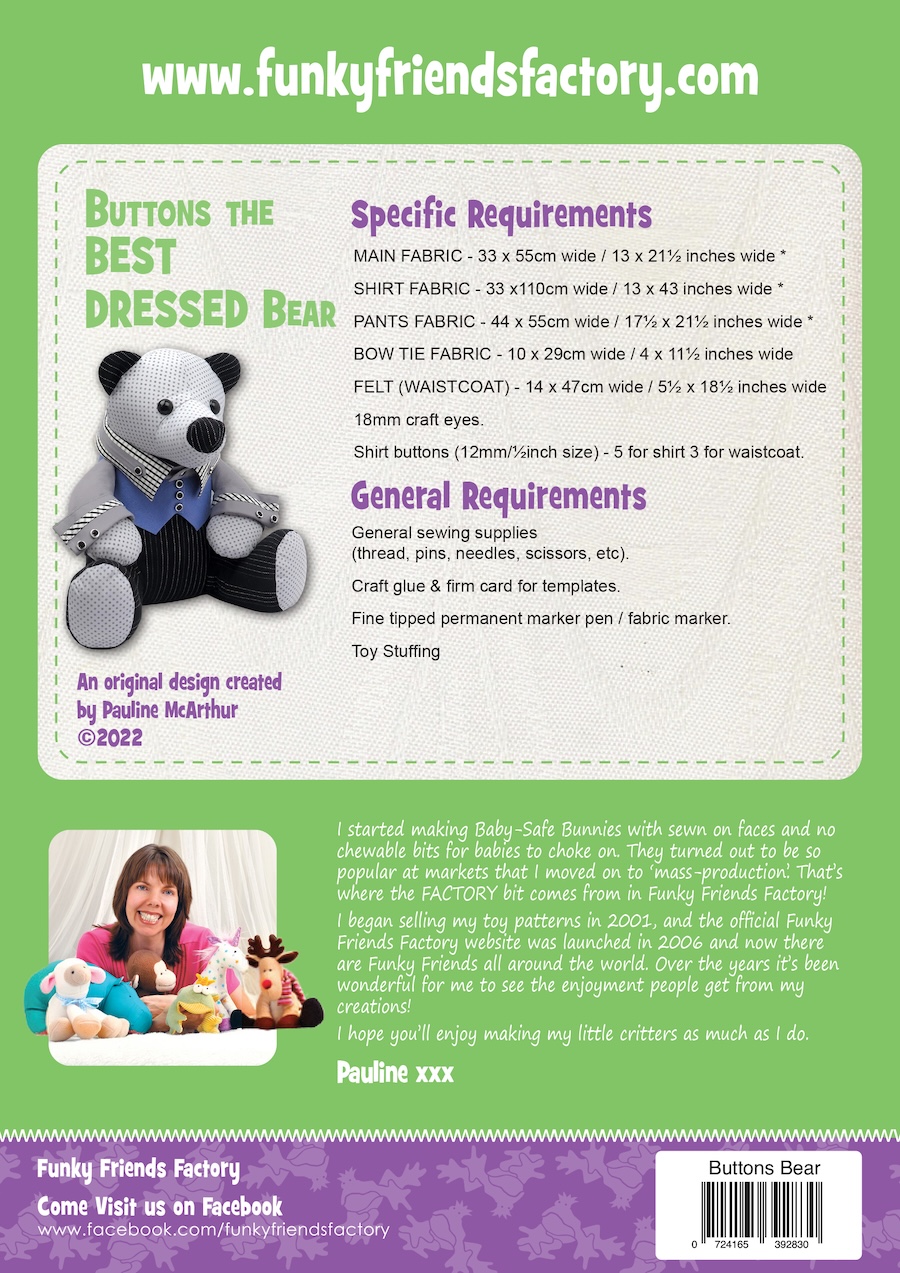 This non-jointed teddy bear features built-in shirt and trousers details plus a felt waistcoat, designed either for making a memory bear from pre-loved clothing, or for using new fabrics with collar, cuffs and bow tie pieces included.