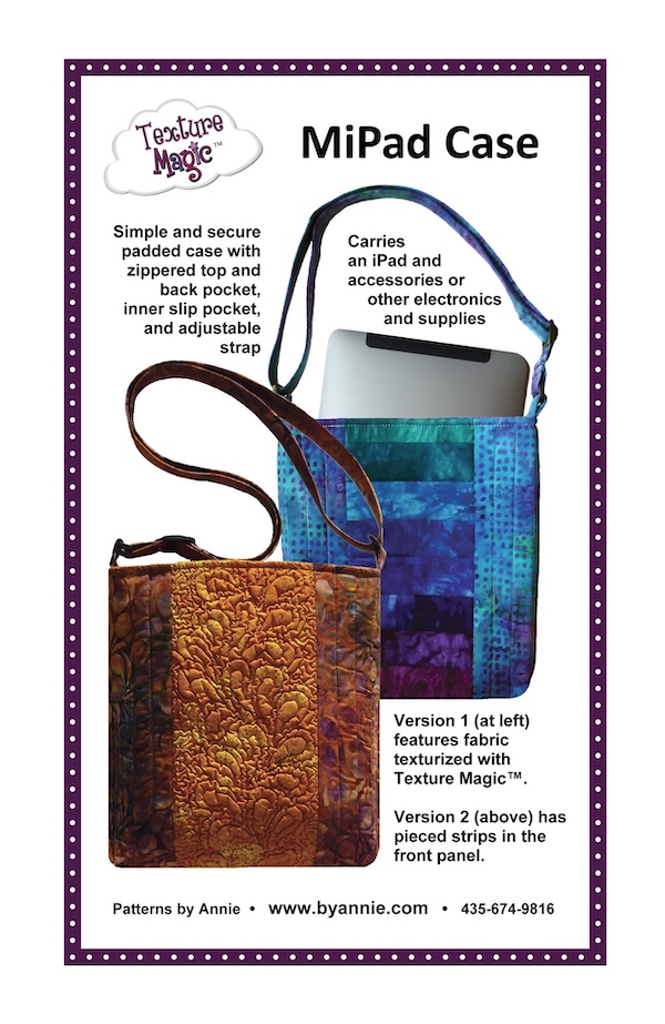 • Version 2 (blue case shown) showcases pieced strips, with hand-dyed fabrics in gradated colors... | | |