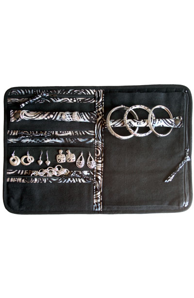 | | (Code: BAP171) This handy case keeps your treasured jewelry protected and organized, minimizing tangles, twists, and knots. Individual ring, earring, and bracelet bars help arrange all your favorites. Three flannel-lined zippered pockets securely hold bracelets, pins, and large loop earrings.