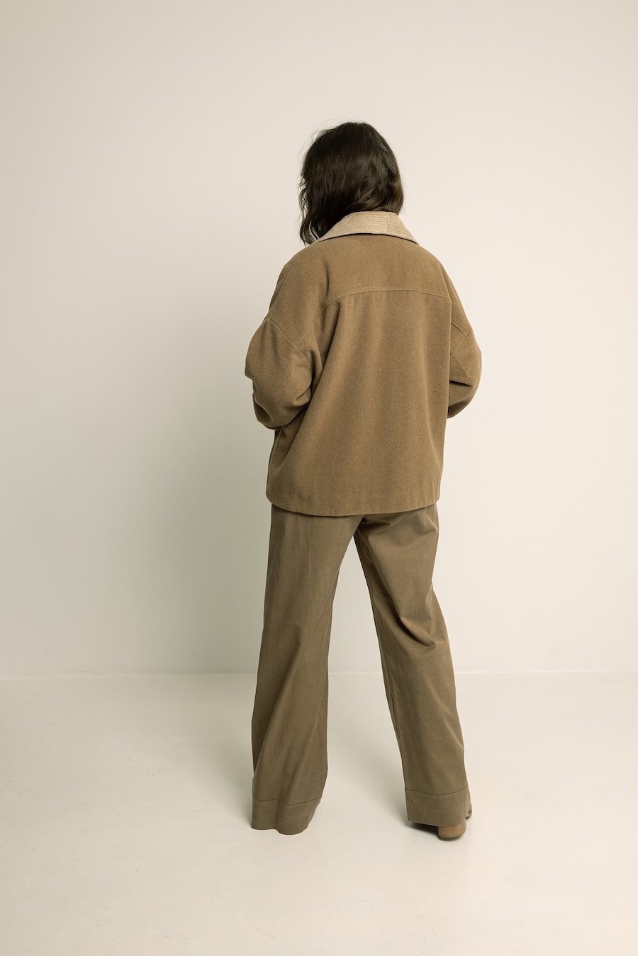 Works beautifully in medium to heavyweight woven fabrics such as wool, boiled wool, tweed, jacquard, denim, or heavy cotton. Select a fabric with sufficient structure to maintain the jacket’s shape.