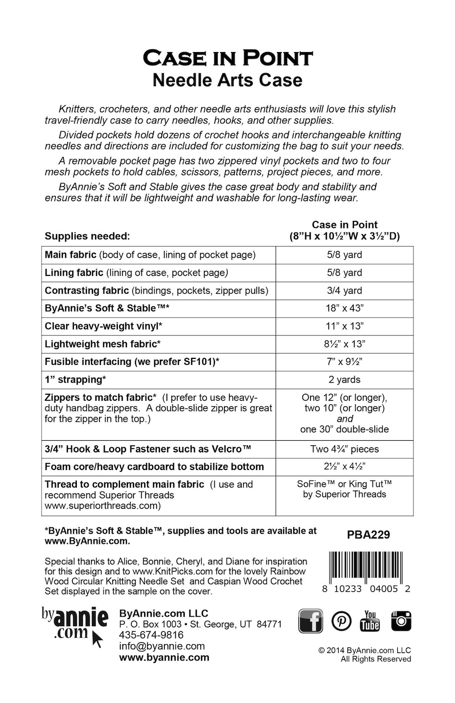 A removable pocket page features two zippered vinyl pockets and two to four mesh pockets to store cables, scissors, patterns, project pieces, and more. ByAnnie’s Soft and Stable provides excellent body and stability while keeping the case lightweight and washable for long-lasting durability.