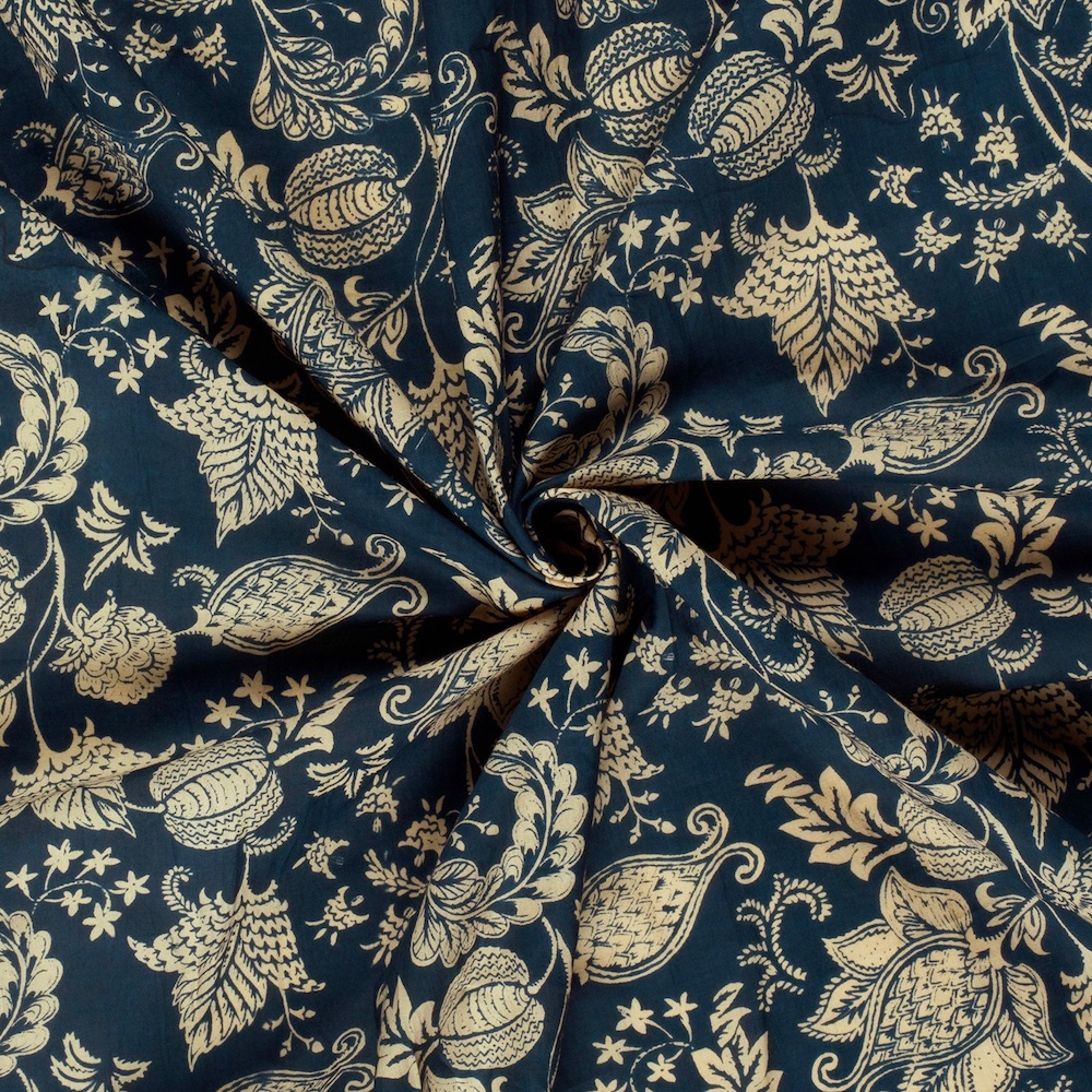 Cream On Indigo Floral Indian Block Print In Cotton By Modelo Fabrics