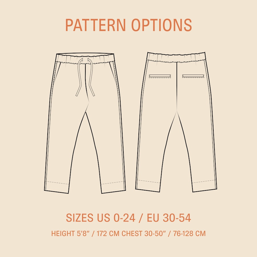 1. #About#The Easy pants sewing pattern is a classic pair of pull-up pants for woven fabric, with elastic waistline, side pockets, optional back welt pockets, slim leg, and cuffed hem.