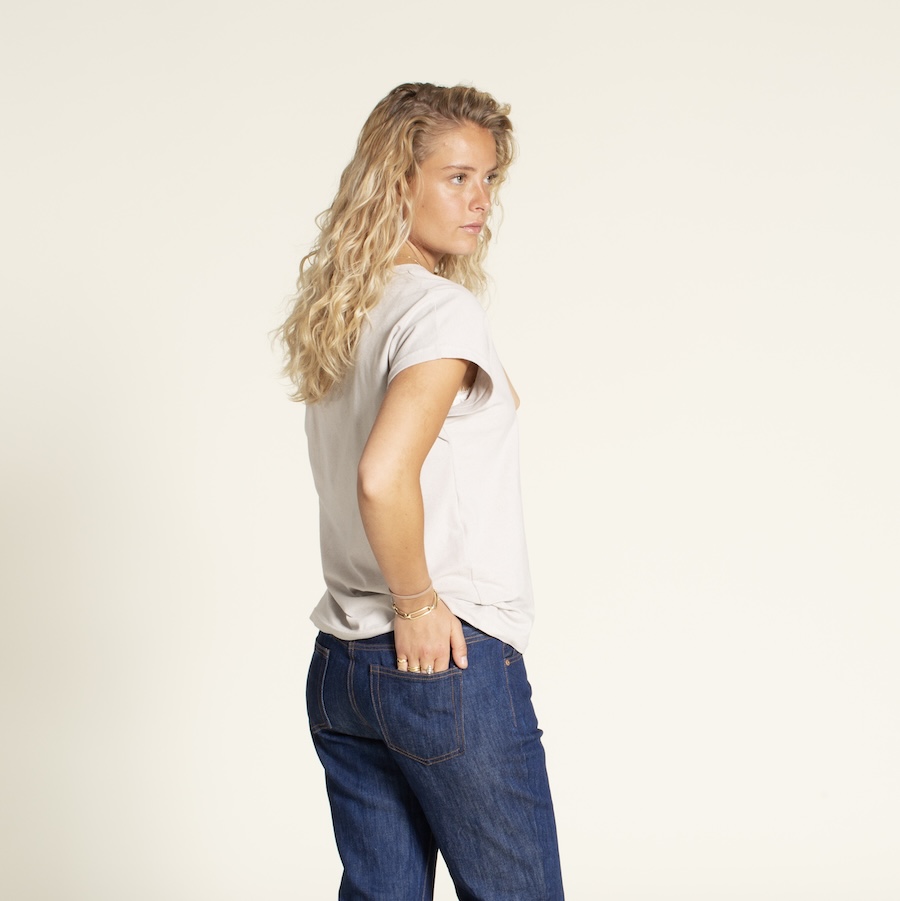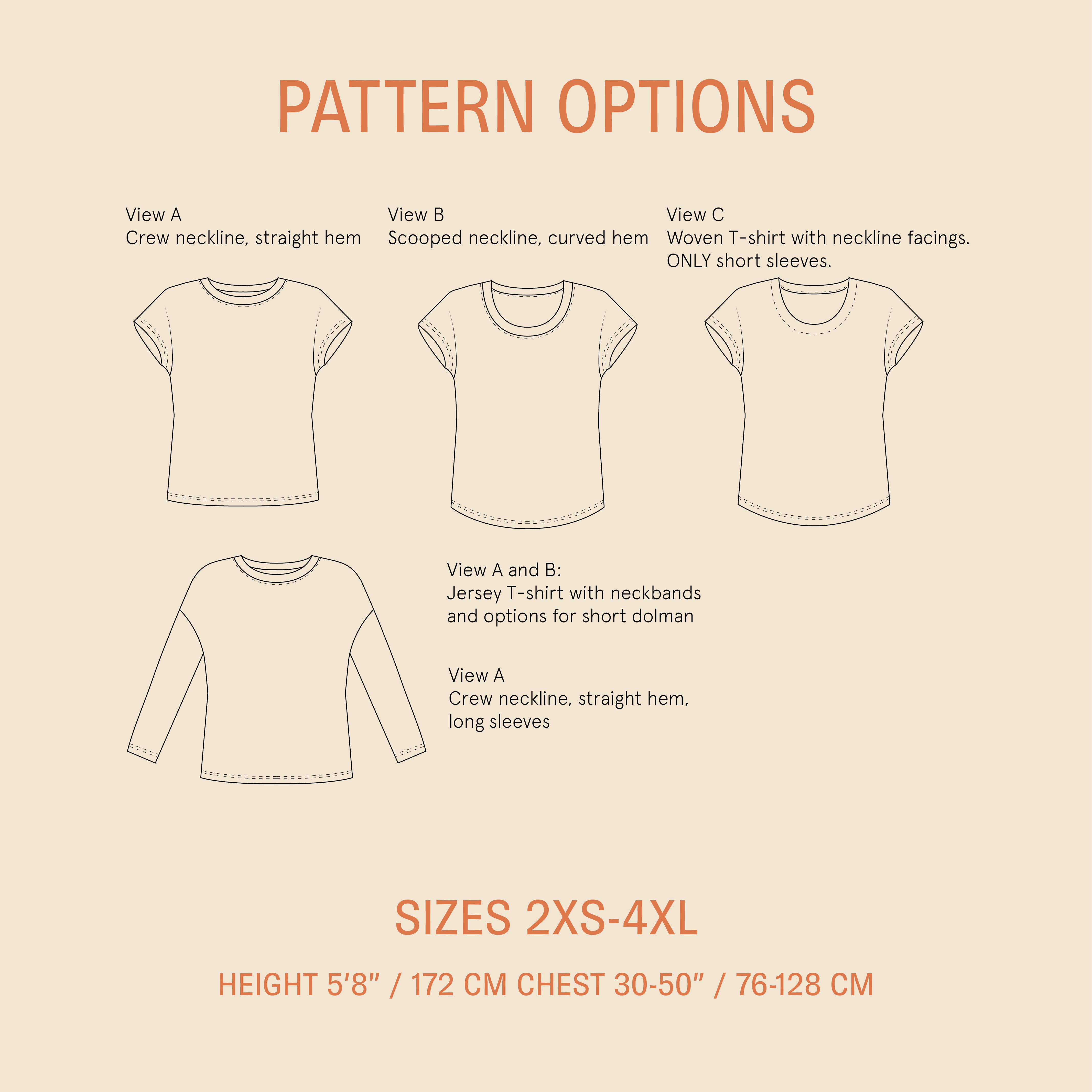 The Easy T-Shirt Sewing Pattern by Wardrobe By Me offers a relaxed-fitting T-shirt with Dolman sleeves, providing versatility and comfort. This pattern includes two length options and two neckline styles, allowing for customization with either a neckband or facing. Suitable for both jersey and lightweight woven fabrics, it accommodates short or long sleeves. The design features a dropped Dolman shoulder, crew and scooped neckline options, and the choice between banded or faced necklines. This pattern is available as a PDF, printable on Letter, A4, A0 paper formats, and includes a separate projector file.
