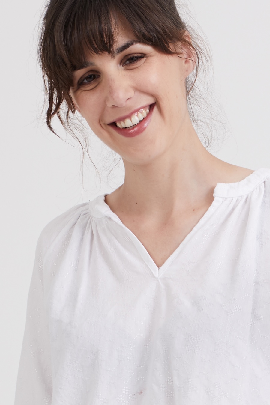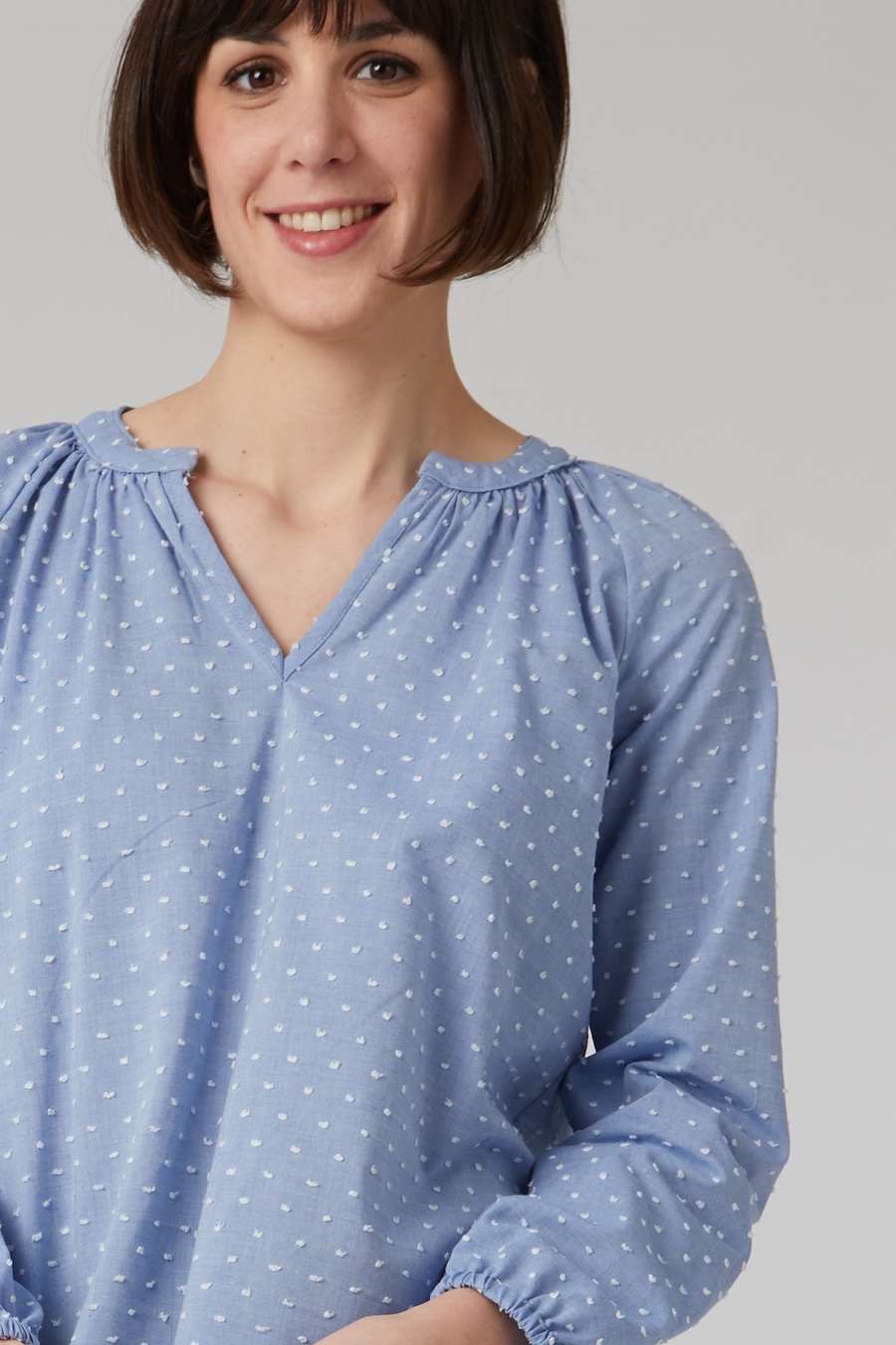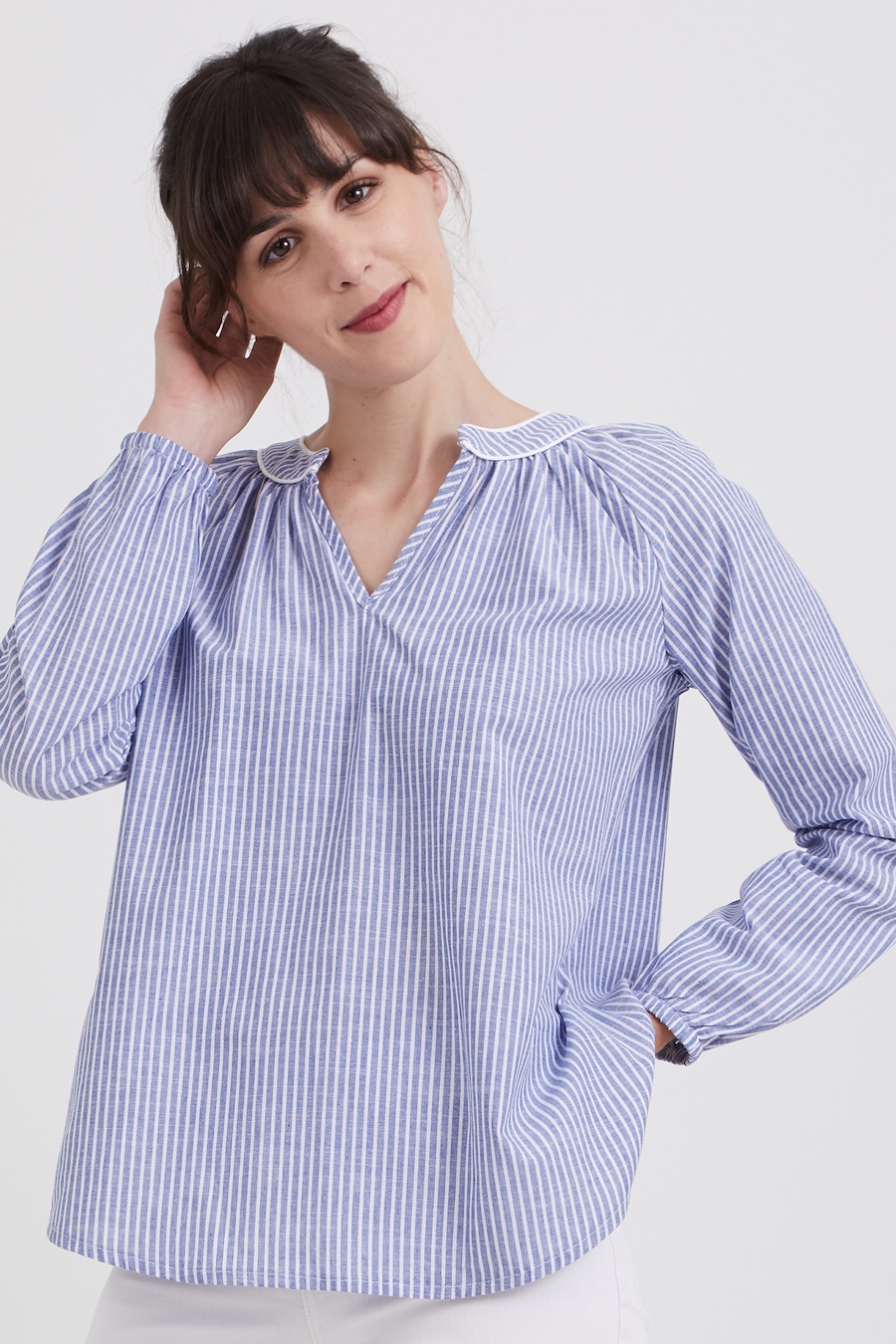 The Estelle Tunic by Coralie Bijasson is a chic bohemian-style blouse featuring raglan sleeves, a gathered round neckline with a front slit, and a shirt-tail hem. The elasticated cuffs add comfort and style, while the V-shaped décolleté accentuates the silhouette, making it a timeless addition to any wardrobe.