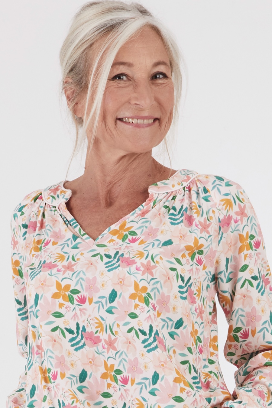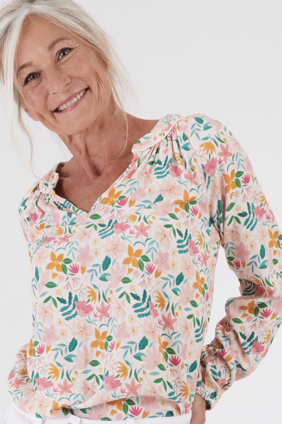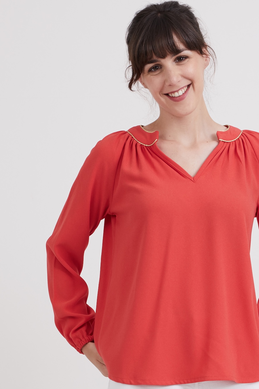 The Estelle Tunic by Coralie Bijasson is a chic bohemian-style blouse featuring raglan sleeves, a gathered round neckline with a front slit, and a shirt-tail hem. The elasticated cuffs add comfort and style, while the V-shaped décolleté accentuates the silhouette, making it a timeless addition to any wardrobe.