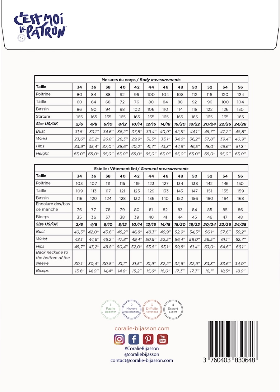 Available in sizes FR 34–48 (US 2–16, UK 6–20), the pattern includes detailed instructions in both French and English. A comprehensive video tutorial is available on Coralie Bijasson's YouTube channel to guide you through the sewing process.