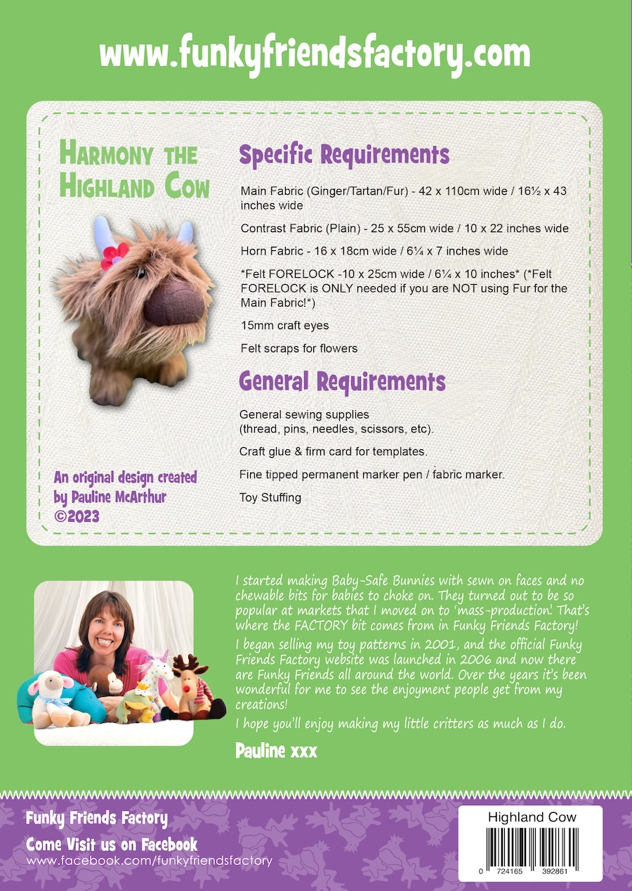 Harmony the Highland Cow (or ‘coo’) is happiest frolicking in the Scottish heather. Her sturdy body makes her a perfect toy for kids or a trendy décor item. You can sew Harmony in most fabrics—including quilting cottons, cuddle fabrics or even fake fur. A felt forelock pattern piece is included so you don’t need to use fur, and flower-crown pieces are included for optional embellishment.