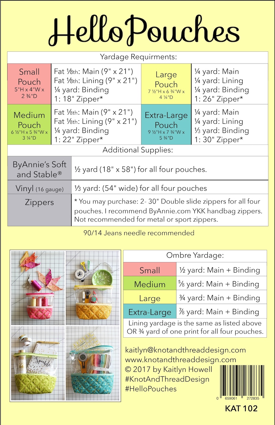 Enjoy stitching up these sweet little zippered pouches. They feature a quilted base for stability and a see-through vinyl top so you can say hello to all your treasured trinkets. Pattern includes instructions to make all four sizes.