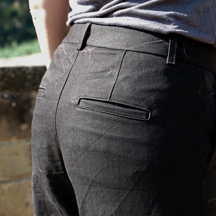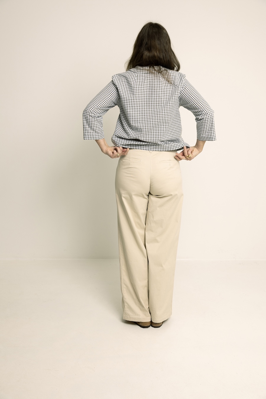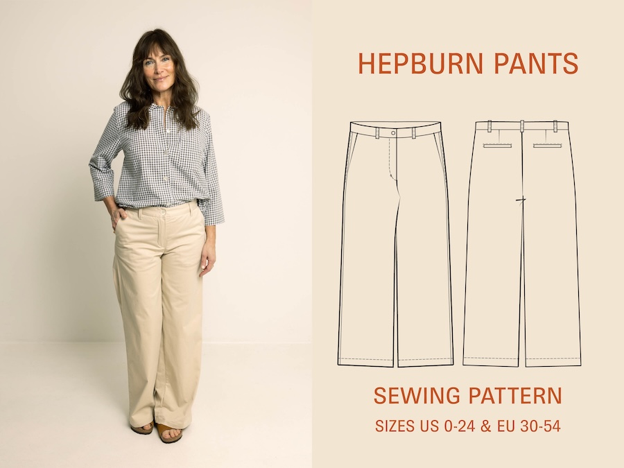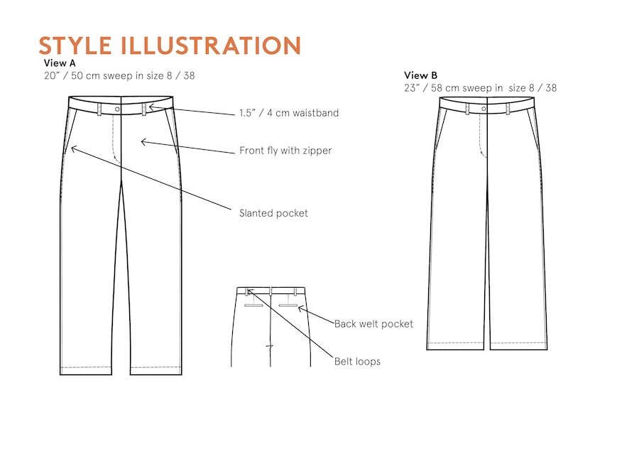 The Hepburn pant sewing pattern is a high waisted pair of pants with back welt pockets, front fly with zipper, side pockets, and waistband with five belt loops. Choose between two leg sweep options; A is 19,5” / 50 cm and sweep B is 23” / 58 cm (in size 8 / 38).