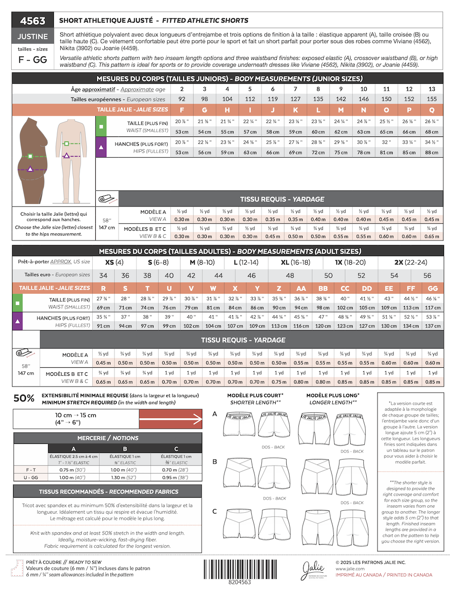 Versatile athletic shorts pattern with two inseam length options and three waistband finishes exposed elastic (A) crossover waistband (B) or high waistband (C). This pattern is ideal for sports or to provide coverage underneath dresses like Viviane (4562) Nikita (3902) or Joanie (4459).