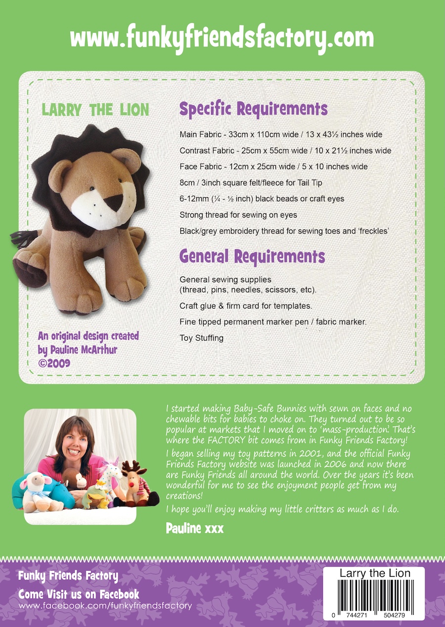 Larry the Lion is a playful, character-filled soft toy with a wonderful scruffy mane created from felt or fabric strips. His friendly face and sturdy body make him a fun project to sew, and he looks fantastic in bold prints or bright colours. A great design for showcasing textures and creating a truly personality-packed lion.
