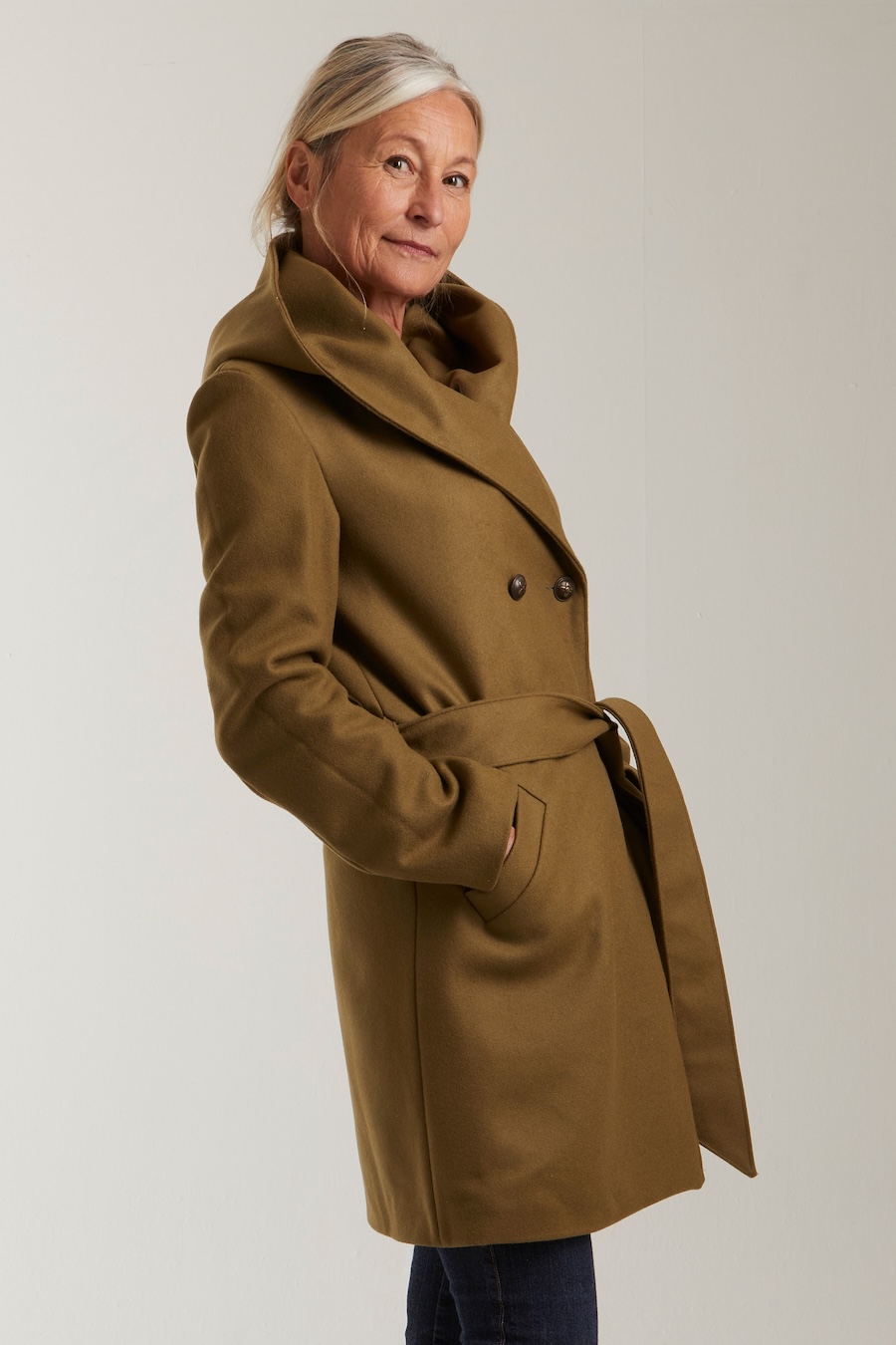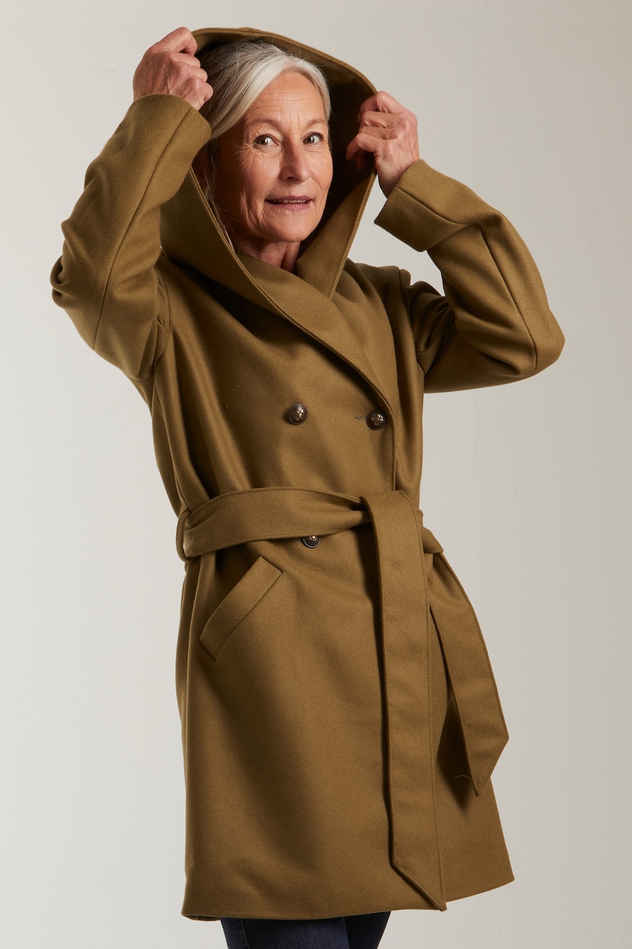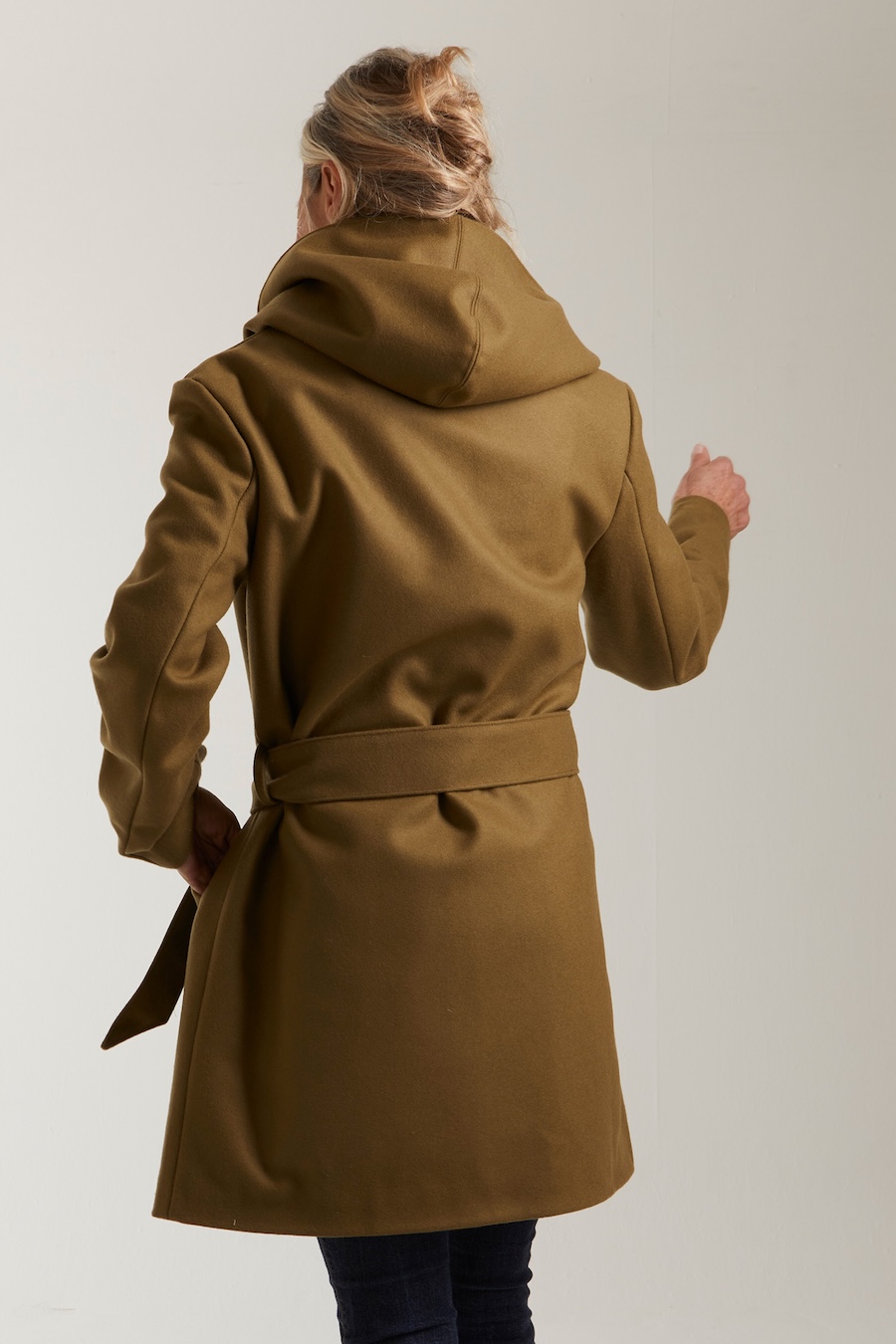 The Namasté Coat by Coralie Bijasson is a cozy and stylish winter garment designed to wrap you in warmth. Featuring a large hood, double-breasted closure, and a wide tie belt, this mid-thigh length coat combines comfort with elegance. Thoughtful details like farmer-style pockets add a unique charm, making it a must-have piece in your winter wardrobe.