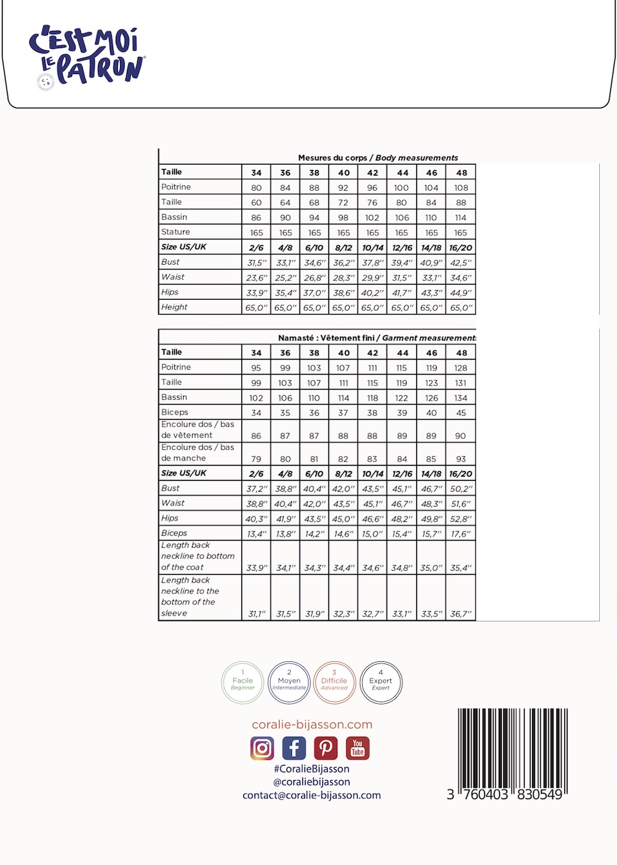 Available in sizes FR 34–56 (US 2–24, UK 6–28), this pattern is suitable for expert sewists. A video tutorial is also available to guide you through the sewing process.
