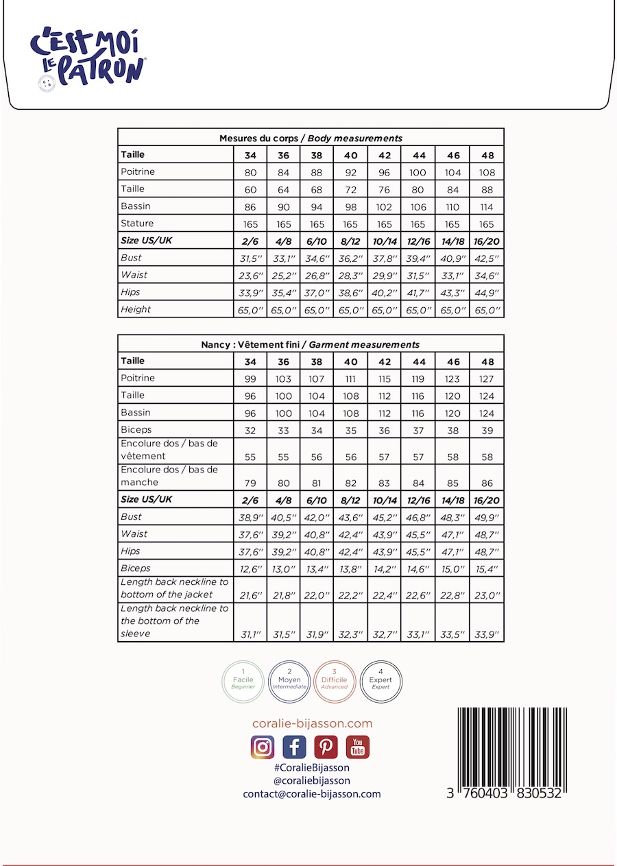 Available in sizes FR 34–48 (US 2–16, UK 6–20), the pattern includes comprehensive instructions in both French and English. A detailed video tutorial is available on Coralie Bijasson's YouTube channel to guide you through the sewing process.