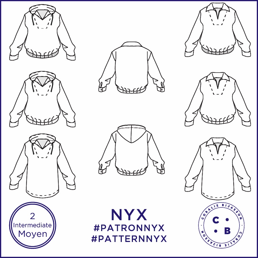 The Nyx Smock Jacket by Coralie Bijasson is a modern, comfortable, and versatile garment designed to suit various styles and preferences. This pattern offers multiple customization options, including a choice between a collar or a hood, and different hemline finishes such as an elastic waistband, ribbed edging, or a straight cut. With six possibilities in one pattern, Nyx is a must-have addition to your wardrobe.