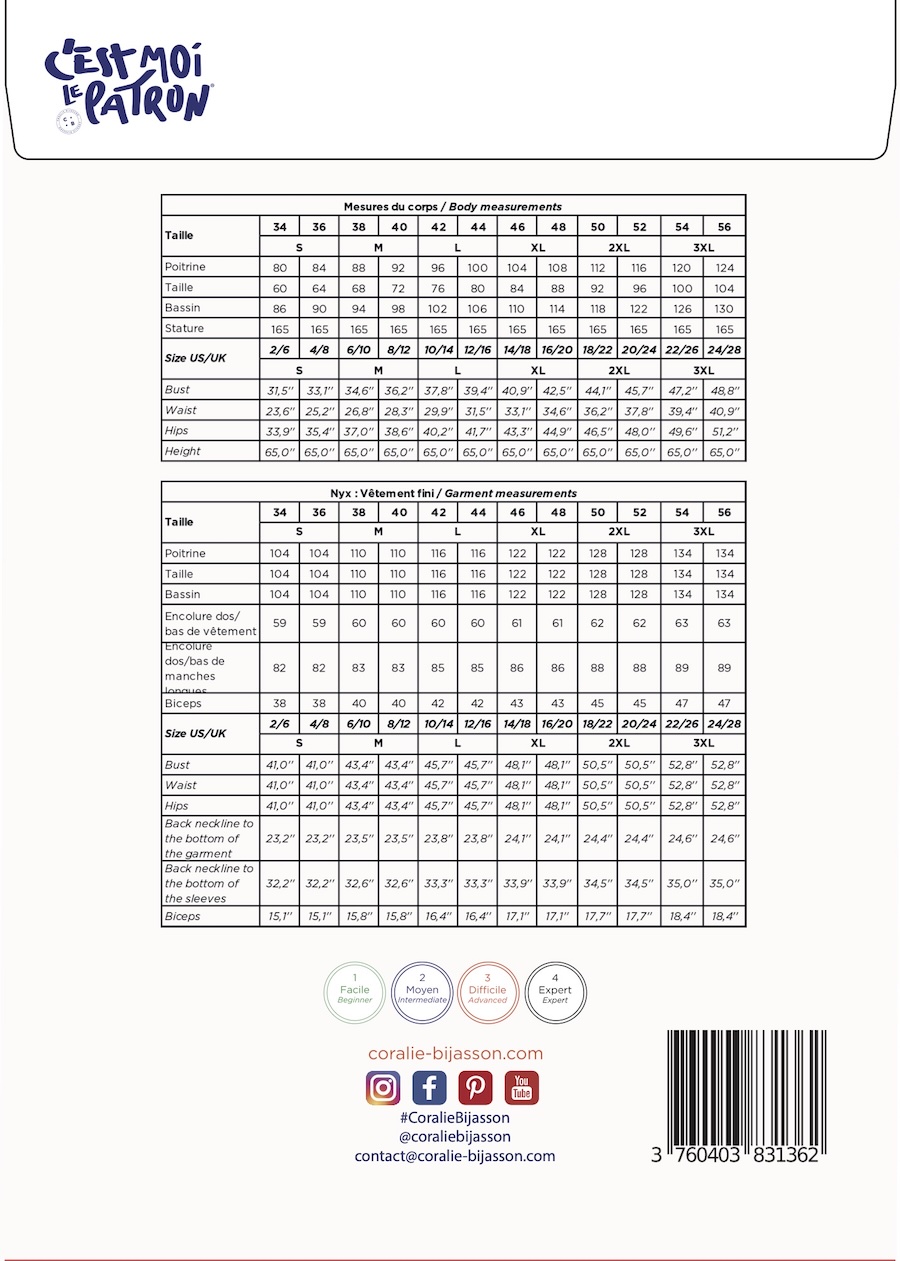 Available in sizes S to 3XL, the pattern includes comprehensive instructions in both French and English. A detailed video tutorial is available on Coralie Bijasson's YouTube channel to guide you through the sewing process.