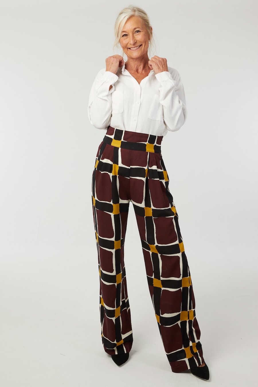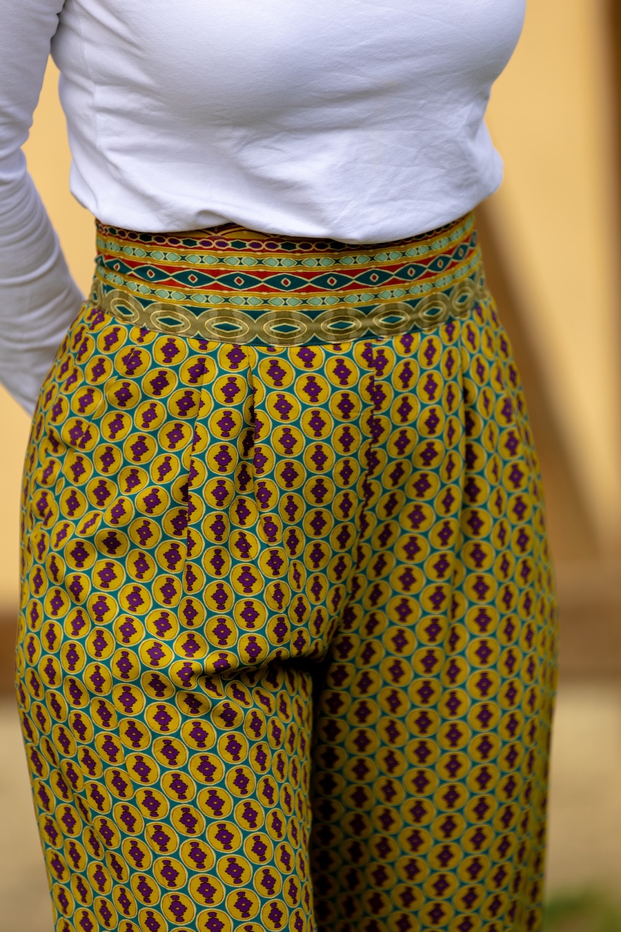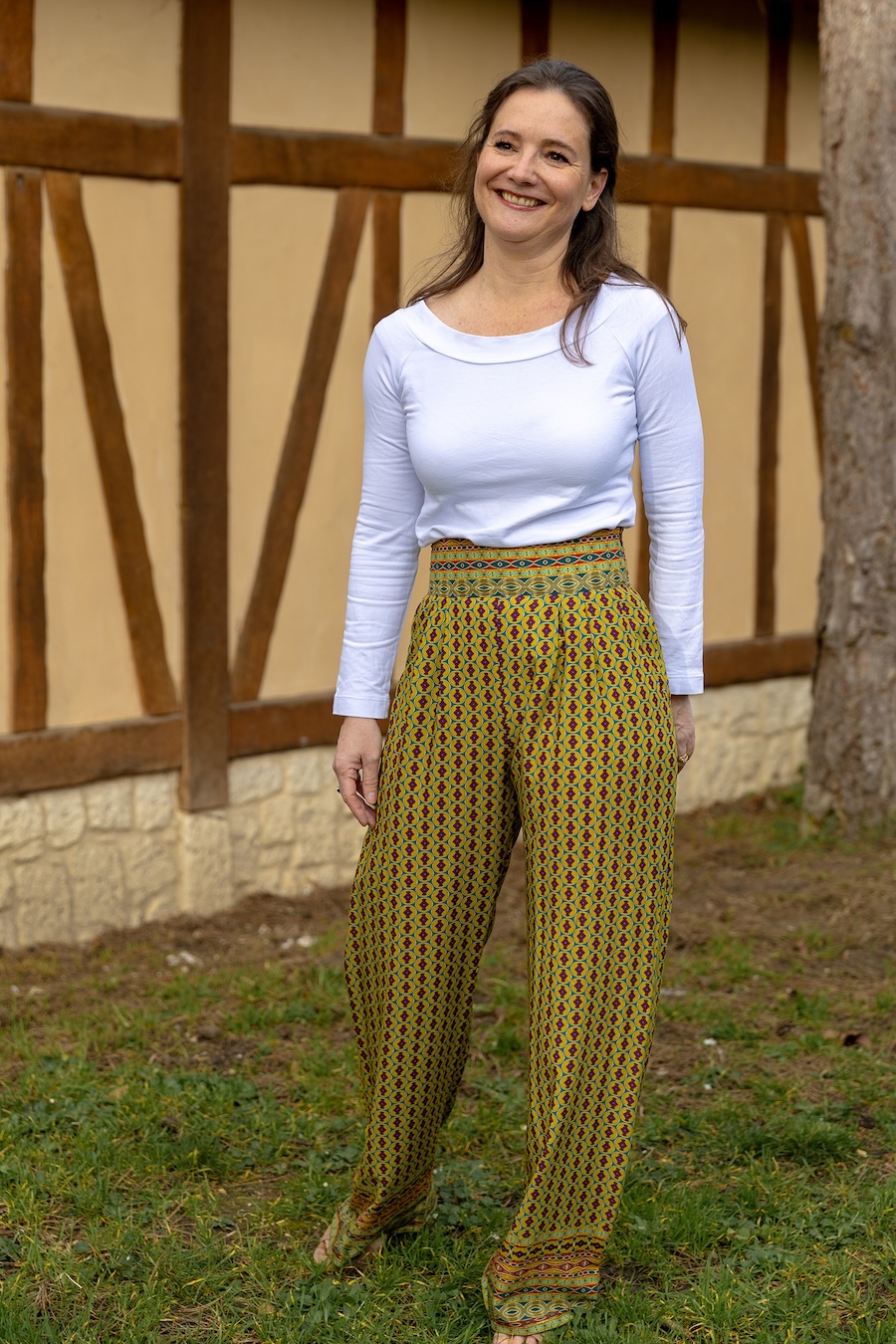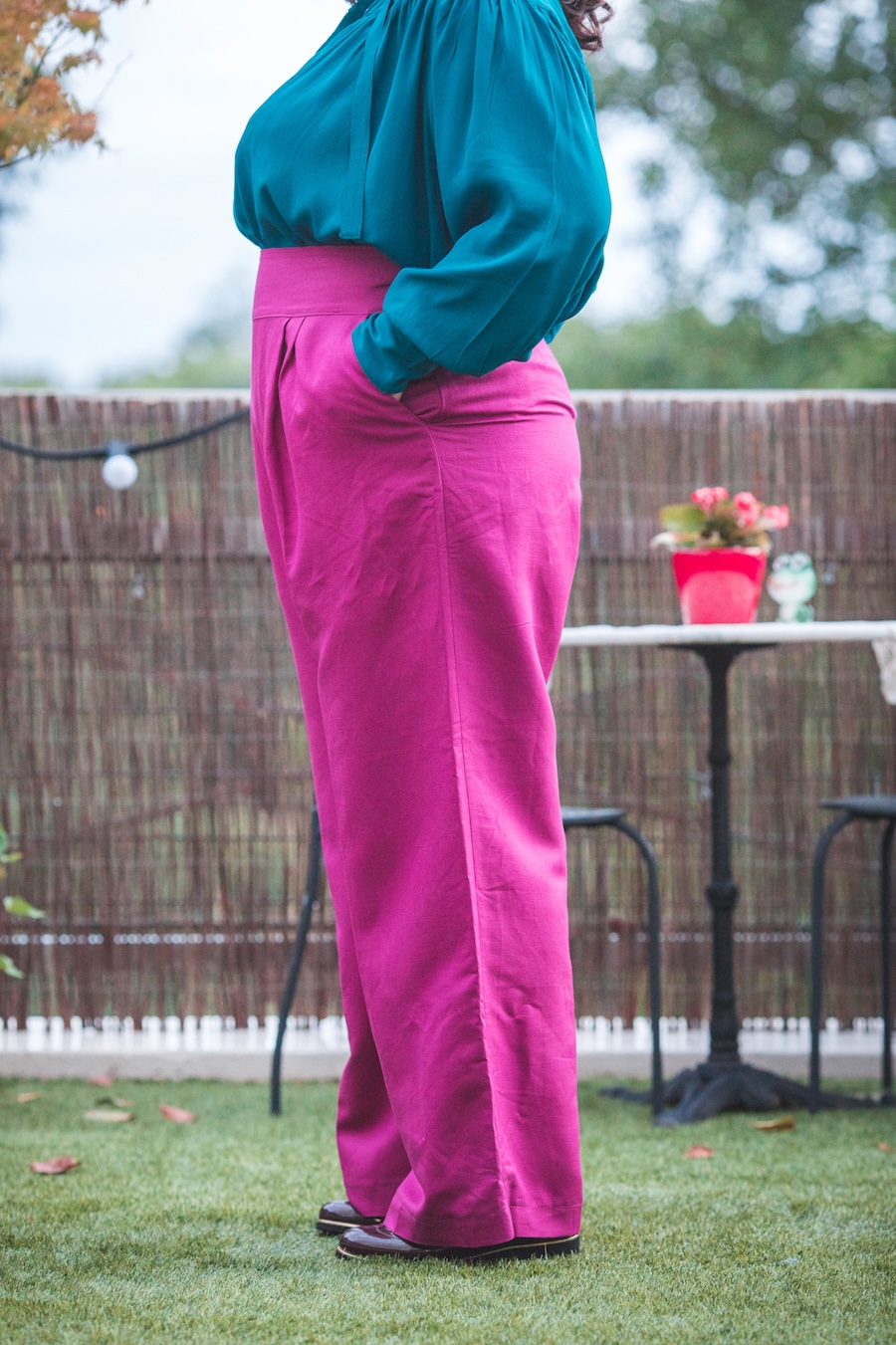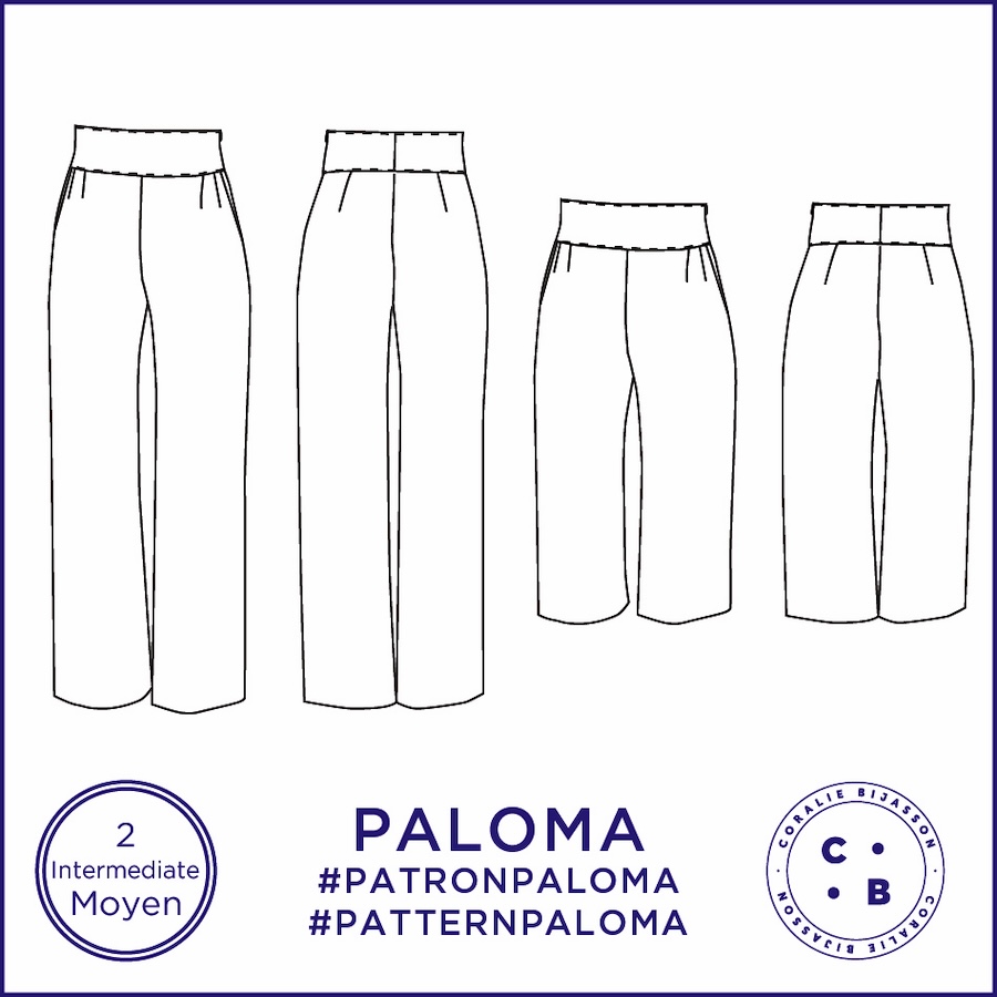 The Paloma Pants by Coralie Bijasson offer a versatile pattern featuring two options: full-length trousers or cropped culottes. Both styles showcase wide legs, pleats, and a high, broad waistband that elegantly closes with an invisible side zipper. This design provides a flattering silhouette that elongates the figure, combining timeless elegance with modern comfort.