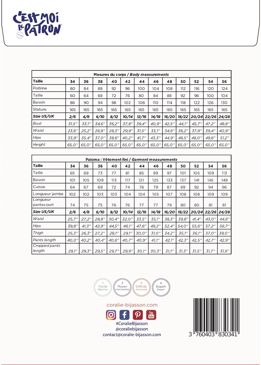 Available in sizes FR 34–56 (US 2–24, UK 6–28), the pattern includes comprehensive instructions in both French and English. A detailed video tutorial is available on Coralie Bijasson's YouTube channel to guide you through the sewing process.