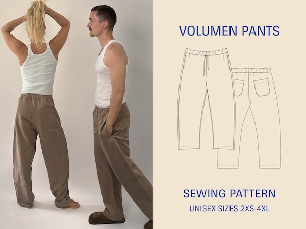 | | (Code: WBMP060) Unisex Volume Pants Sewing Pattern are a pair of pull-on pants for woven fabric with an elastic waistline and side and back pockets. The fit is comfortable with curved side seam that creates a barrel leg shape.