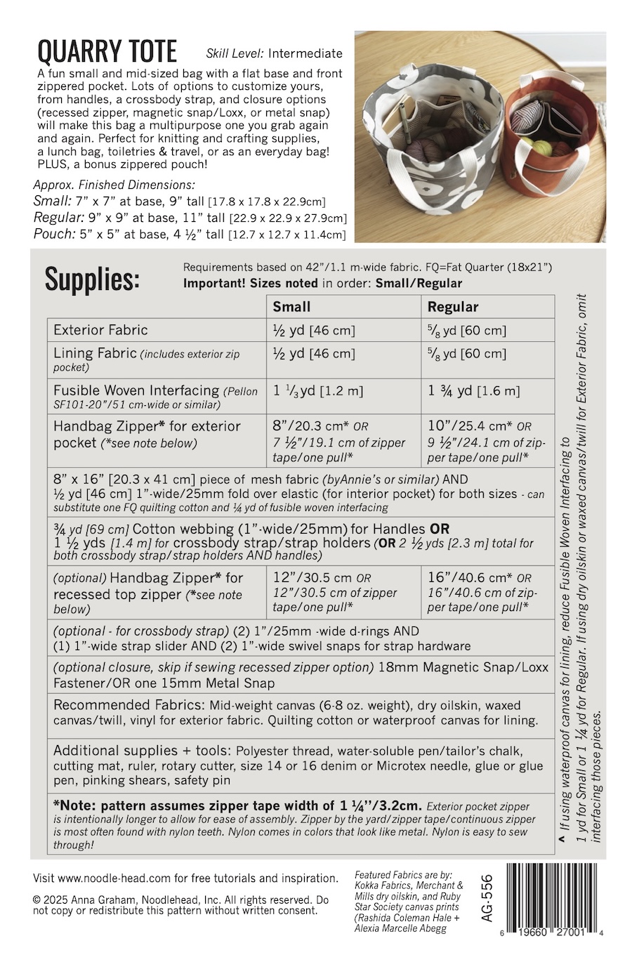 • Lining Fabric (includes exterior zip pocket): 46 cm (½ yd) for Small / 60 cm (5/8 yd) for Regular