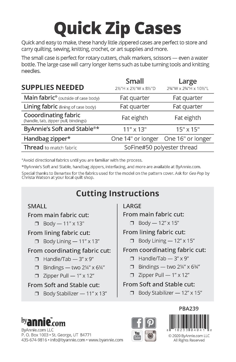 Quick and easy to make these handy little zippered cases are perfect to store and carry quilting supplies art supplies knitting needles crochet hooks and lots more. The small case is perfect for rotary cutters chalk markers scissors and more. The long case is sized to carry longer items such as tube turning tools and bodkins. SMALL 2H x 2W x 8D LARGE 2H x 2W x 10D