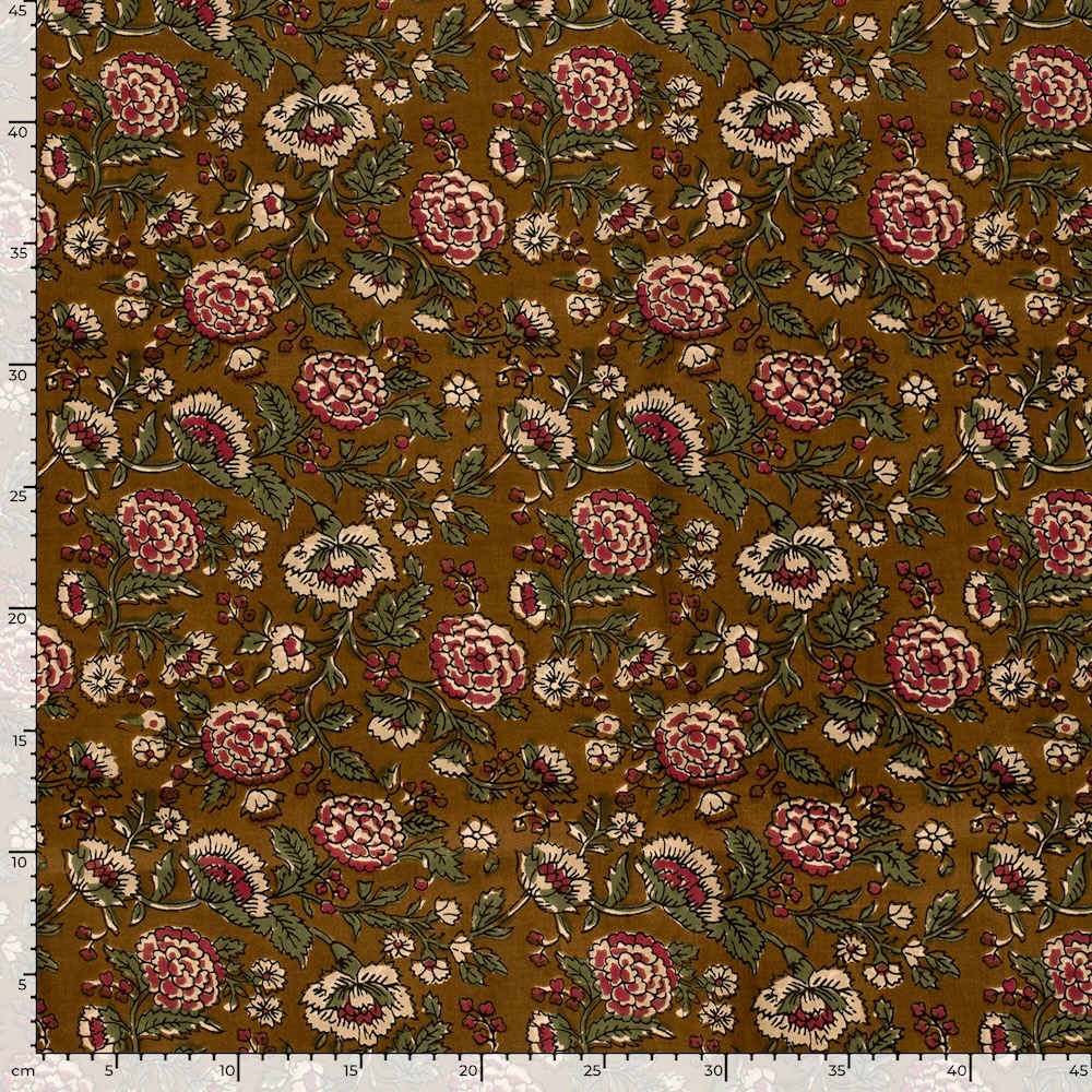 Red On Olive Floral Indian Block Print In Cotton By Modelo Fabrics