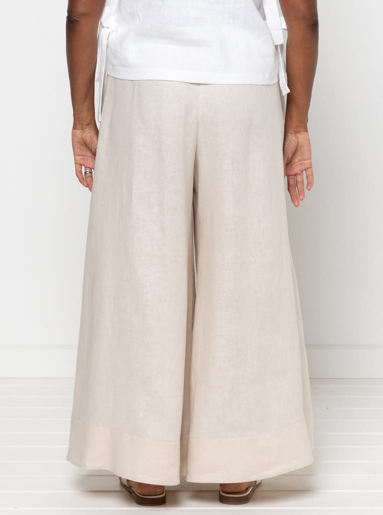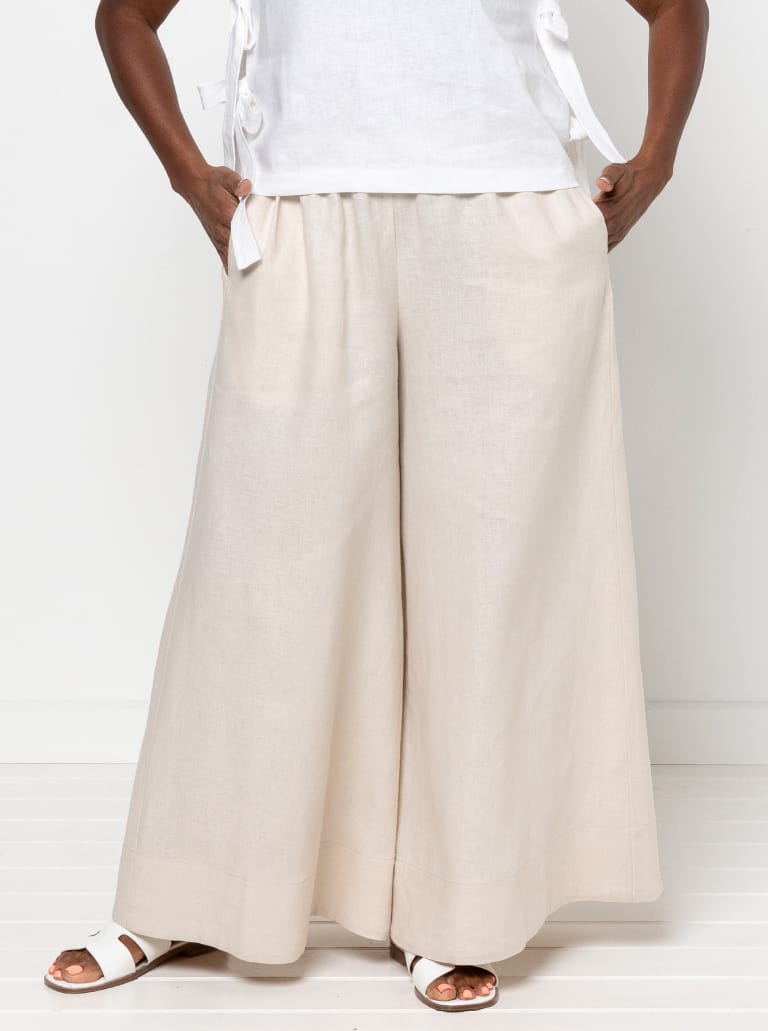 The Rumi Woven Skirt and Pant sewing pattern features an elastic waistband that sits on the natural waist. The design includes options for very wide-leg pants in cropped or long lengths, an A-line skirt, optional inseam pockets, and wide hem facings. Quick and easy to sew, the Rumi is a versatile beginner-friendly pattern with shorten/lengthen lines included.
