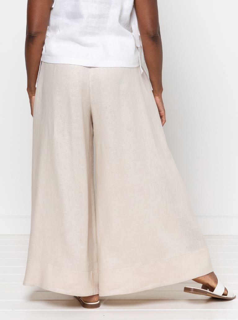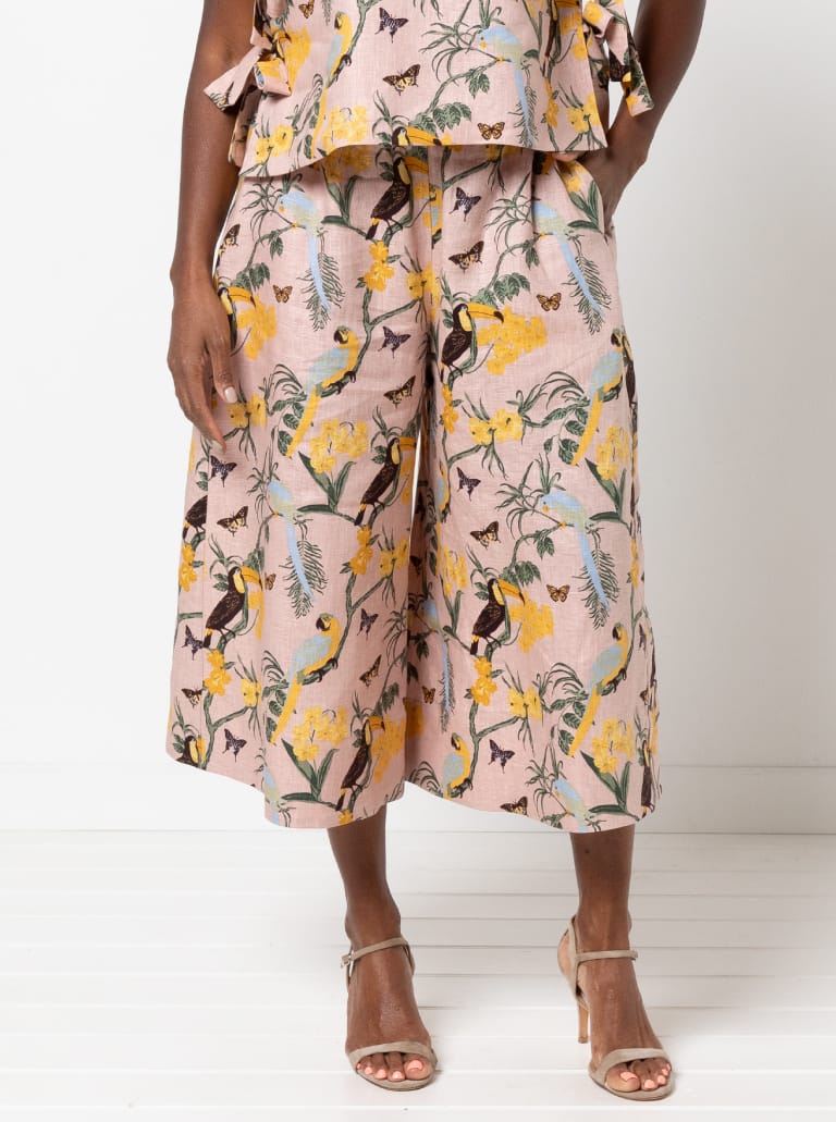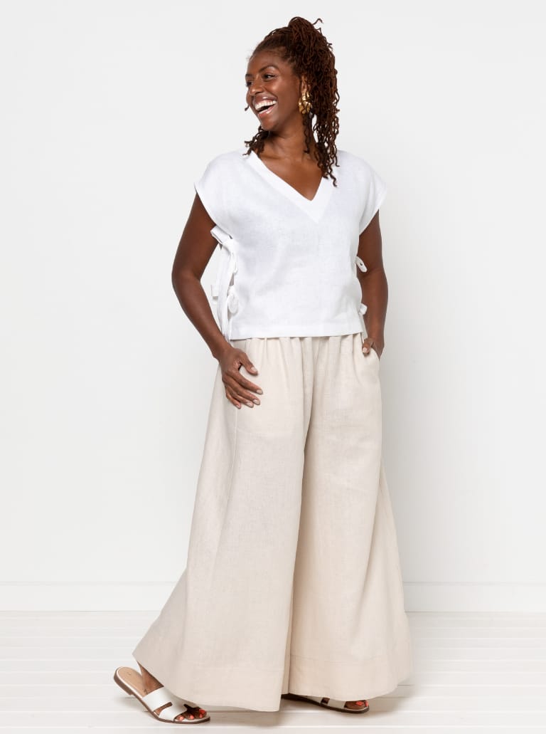 The Rumi Woven Skirt and Pant sewing pattern features an elastic waistband that sits on the natural waist. The design includes options for very wide-leg pants in cropped or long lengths, an A-line skirt, optional inseam pockets, and wide hem facings. Quick and easy to sew, the Rumi is a versatile beginner-friendly pattern with shorten/lengthen lines included.