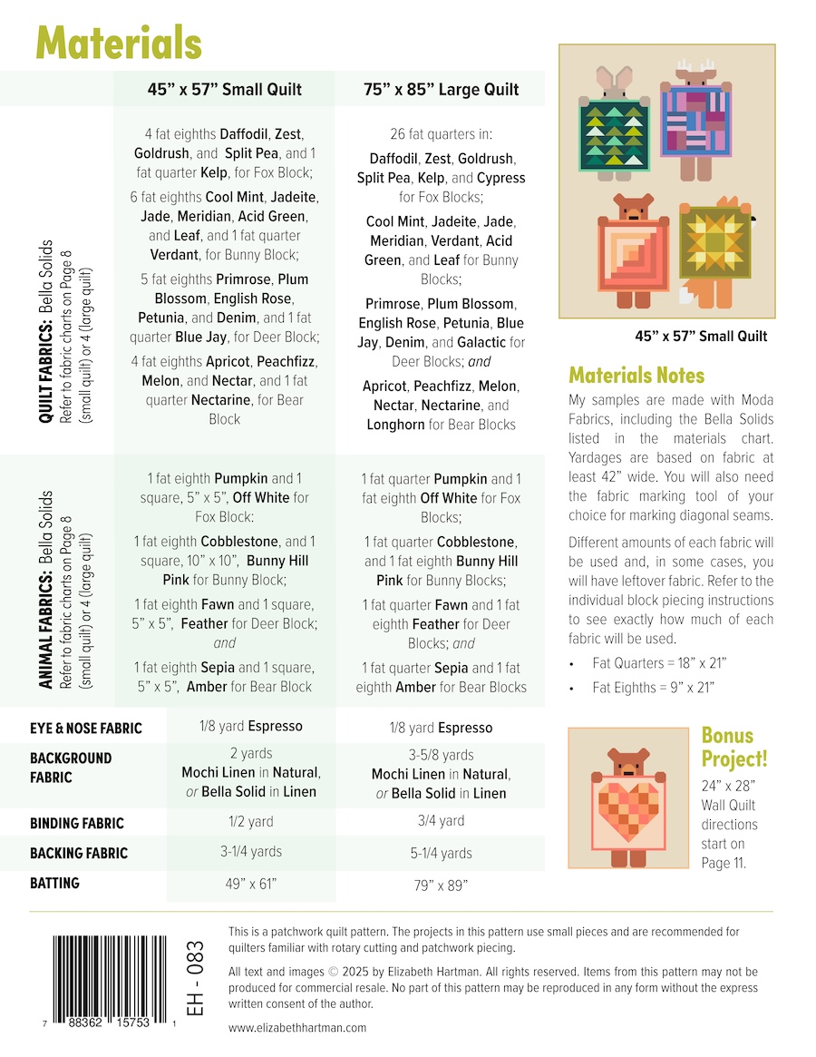 Get ready for the cutest guild meeting ever! Show and Tell features foxes, bunnies, deer, and bears proudly displaying their patchwork quilts. This fat quarter-friendly pattern includes instructions for 12 different mini quilt designs that each animal can “hold,” offering endless mix-and-match possibilities.