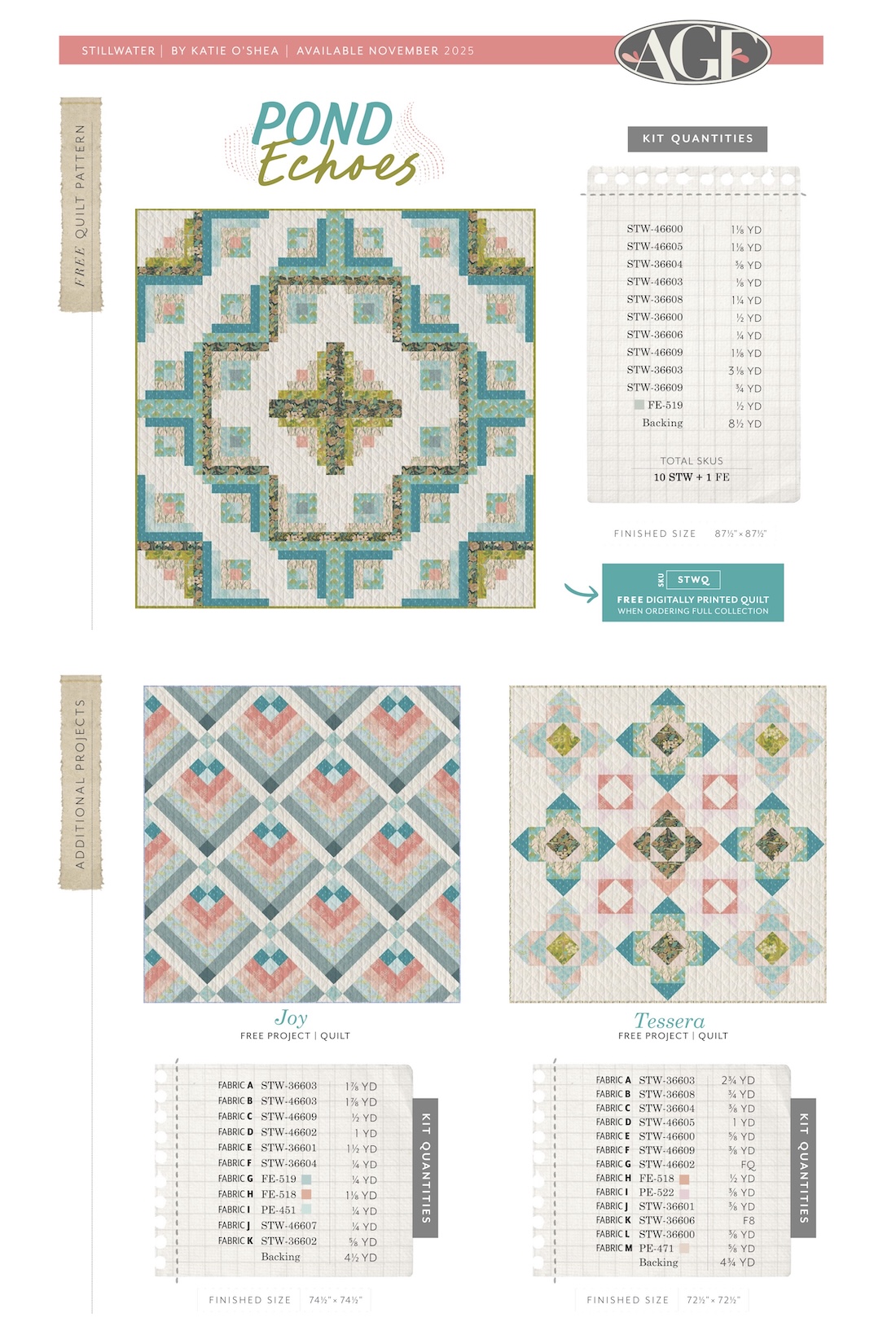 Inspired by a peaceful pond on the Colorado-Utah border, Katie captured the soothing sounds of wildlife and the rhythms of water, day and night. With vibrant aqua, salmon, teal and olive, this collection brings the peaceful essence of nature to your sewing room.