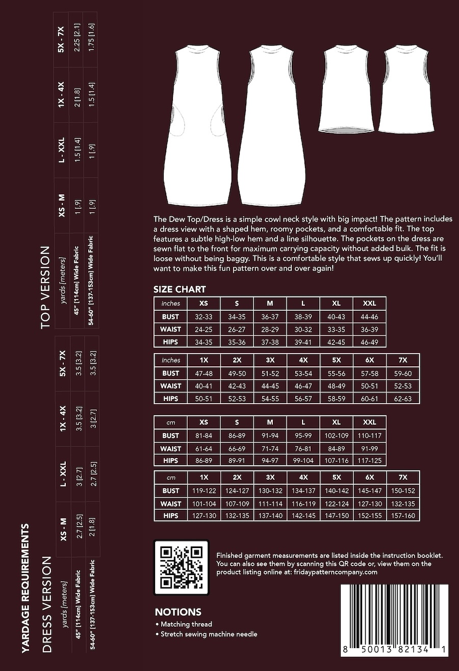 The Dew Top and Dress is a simple cowl neck style with big impact! This pattern includes a dress view with a shaped hem, roomy pockets sewn flat to the front for maximum carrying capacity without added bulk, and a comfortable fit. The top features a subtle high-low hem and a line silhouette. The fit is loose without being baggy, making it a comfortable style that sews up quickly. You'll want to make this fun pattern over and over again!