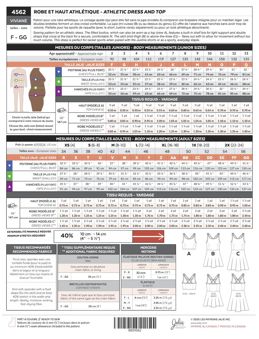 Sewing pattern for an athletic dress. The fitted bodice which can also be worn as a top (view A) features a built-in shelf bra for light support and double straps that cross at the back for a secure comfortable fit. The skirt (mid-thigh (B) or above-the-knee (C)) flares out with to allow for movement without too much volume. This dress is perfect for racket sports when paired with the Justine shorts or as a sporty everyday staple.