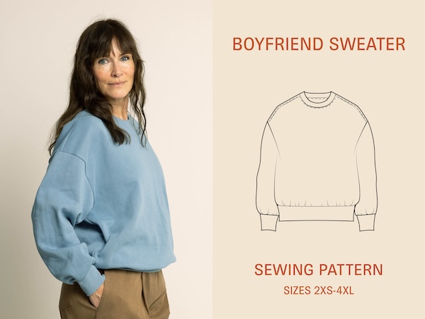| | (Code: WBMP055) The Boyfriend Sweater sewing pattern is the epitome of comfort and style. This casual sweater has a cozy oversized fit. The generously sized sleeves feature exaggerated dropped shoulders enhancing the sweaters laid-back vibe.