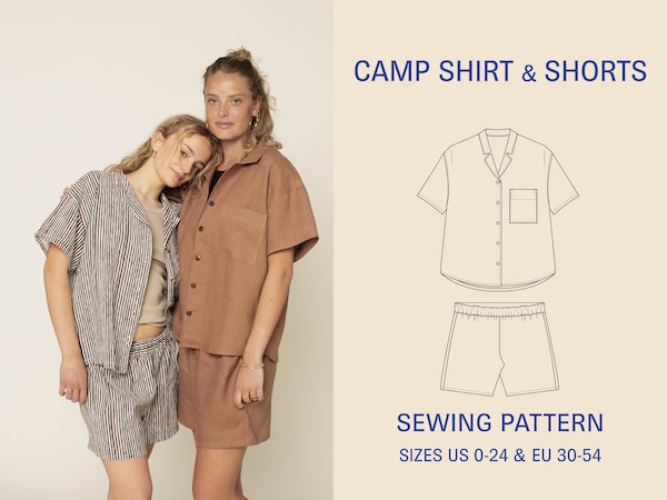 | | (Code: WBMP052) The camp shirt and shorts printed sewing pattern features a boxy oversized shirt with a convertible collar, short sleeves, and a curved hemline. The shorts are simple and roomy, with an elasticated waistline.