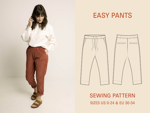 | | (Code: WBMP018) The Easy pants sewing pattern is a classic pair of pull-up pants for woven fabric, with elastic waistline, side pockets, optional back welt pockets, slim leg, and cuffed hem.